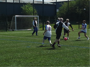 Our second game saw a closely fought battle with Aylesbury ‘B’. The two sides had also met one another in the group stages of the 2015 tournament. On that occasion Rushden & Diamonds had run out comfortable 4-0 winners so this was an opportunity for the ‘Ducks’ to redress the balance. The game got off to a lively start but it was Diamonds who soon found themselves ahead 2- 0 thanks to strikes from Mark. It seemed an unassailable lead but lack of composure in the R&D ranks during the second period gifted the opponent’s two goals in quick succession to level the score. With just minutes left on the clock a long ball punted up field by Jamie found Alan out on the right who fired the ball towards the opposition’s goal only to see it deflected out of play. From the resulting ‘Kick in’ Alan sent a perfectly weighted high ball drifting in to the area which found Mark at the far post who drilled it into the net to secure his hat trick, and a much deserved 3 – 2 win which left R&D Topping their group.