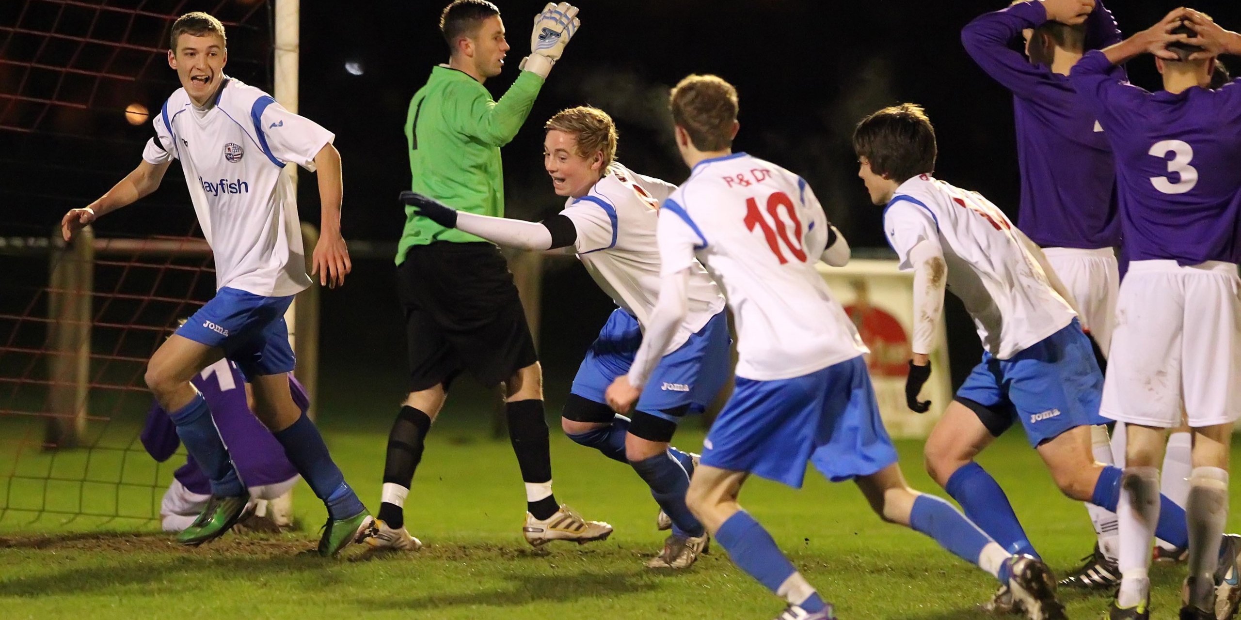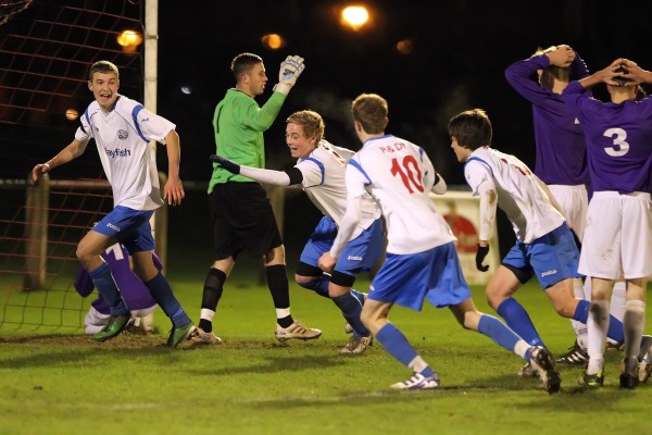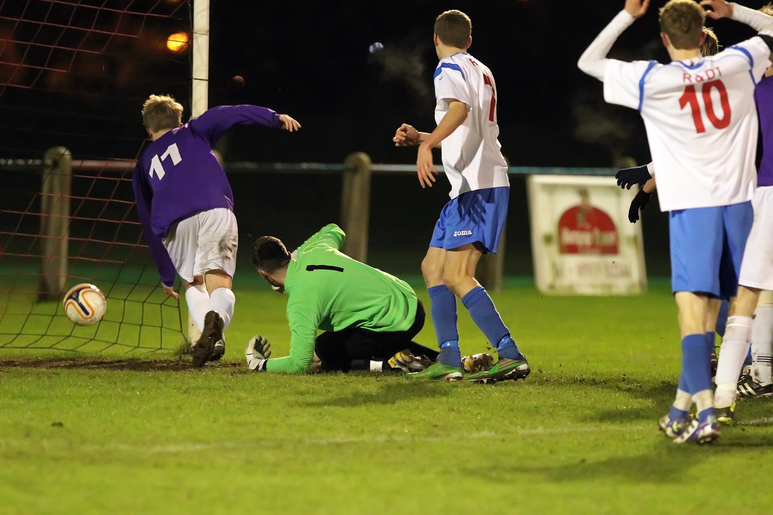 With extra time beckoning, the home side seemed to step up a gear in the final 5 minutes. Meeks was tripped following a good run down the right flank, and picked himself up to deliver a superb cross to the back post, where Danny Bird rose to win the header, nodding the ball inches wide of the post. Two minutes later though the opening goal finally arrived, and it was perhaps fitting that a scrappy game was sealed with the scrappiest of goals. A deep right wing corner saw Bell and Smith challenging for the same ball, although between them they managed to force the ball towards goal. Helsdown, stood right on the line, couldn’t get out of the way in time and blocked the effort, but did manage to swivel and lash the ball into the bottom corner much to the delight of the home support and his teammates.