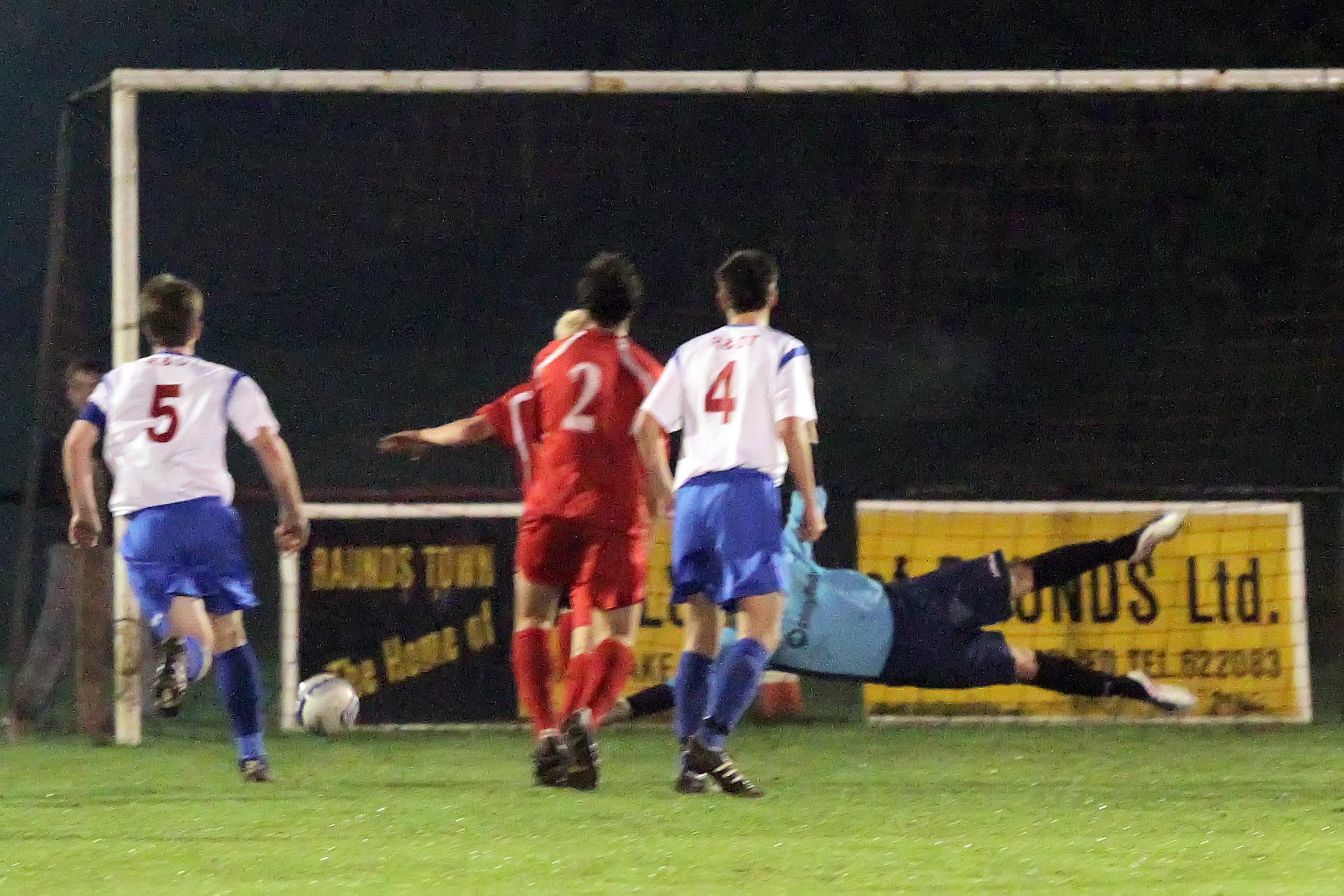 Rushden went in search of an equaliser and almost found it on 18 minutes following an excellent move. Bell played a great ball down the left wing to Thomas, who found the run of Harrison with an excellent pass, but with only the ‘keeper to beat the debutant striker tried to switch the ball onto his stronger right foot which allowed the recovering FCV defence to get in a tackle. Two minutes later and Harrison went close again. Meeks’ pass down the right presented Harrison and Ryan Young with a 50-50 battle to reach the ball first, which Harrison just won, with his shot appearing to strike the visiting ‘keeper on the hand well outside his penalty area. The ref waved away the appeals from the home side, with Young clearing the ball for a throw in. The ball was quickly switched to the left flank where it eventually found its way to Bell 20 yards from goal, and his goalbound volley was well saved.