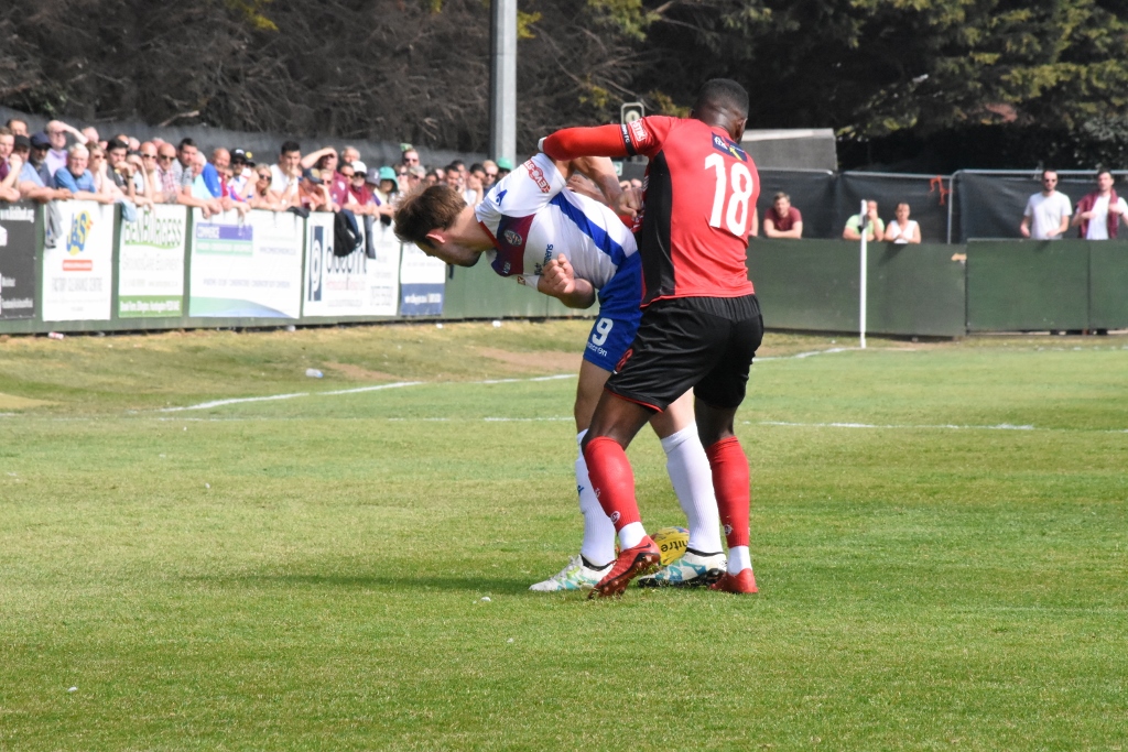 The away side hadn’t threatened much thus far, but they looked like they would fashion an opportunity just before the half-hour mark when Richens played a clever ball over the top of the home defence looking for Holman. It looked like the striker would reach the ball and threaten to get a strike in at goal, but he suddenly pulled up clutching his hamstring. After a few minutes of treatment, he hobbled off to be replaced by Rhys Hoenes.
