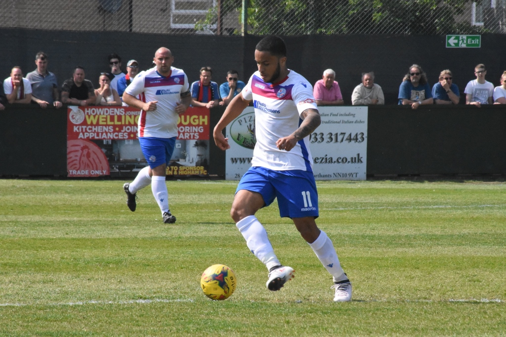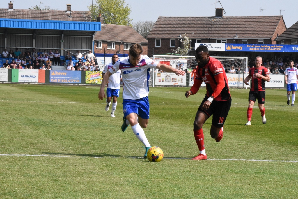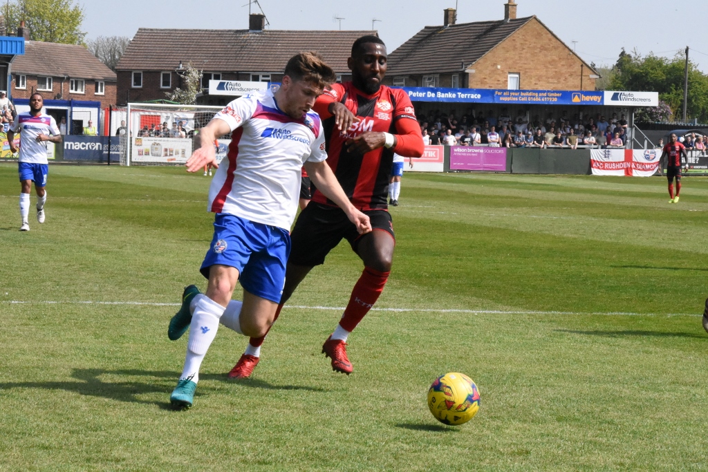 Rushden started the brighter as they pressed and harried their opponents high up the pitch, and this led to a really quick and energetic opening period. Moments after a Sam Brown long-throw bounced just up and over the bar, Jack Bowen almost got in behind the away defence only to be foiled by the keeper. Dan Holman responded for Kettering with a hooked effort that was easily held, and then Aaron O’Connor appeared to be released theough on goal only for the offside flag to be raised. The best chance of the half came in the 16th minute when a long ball over the top by Heath caused confusion between the Kettering keeper and defence, and Bowen nipped in to flick it over the keeper. It ran towards goal but came back off the post, and Bowen then collected the rebound before firing a low effort towards the near-post that was well tipped behind. Jack Ashton rose highest to meet the resultant corner, but his free header was powered wide of the target. Tom Lorraine, who had been announced as the Supporters Player of the Season before kick-off, threatened moments later when he sprinted past one challenge and round another, but his effort flashed well over. The play then settled down after a swift start, and it appeared the game would be deadlocked heading into the interval. However, Kettering took the lead on the stroke of half-time. Full-back Lathaniel Rowe-Turner got down the left after a neat backheel by O’Connor, and he played a ball across that was blocked away. It broke again to the defender though, and he poked a shot past Heath and into the far corner of the net.