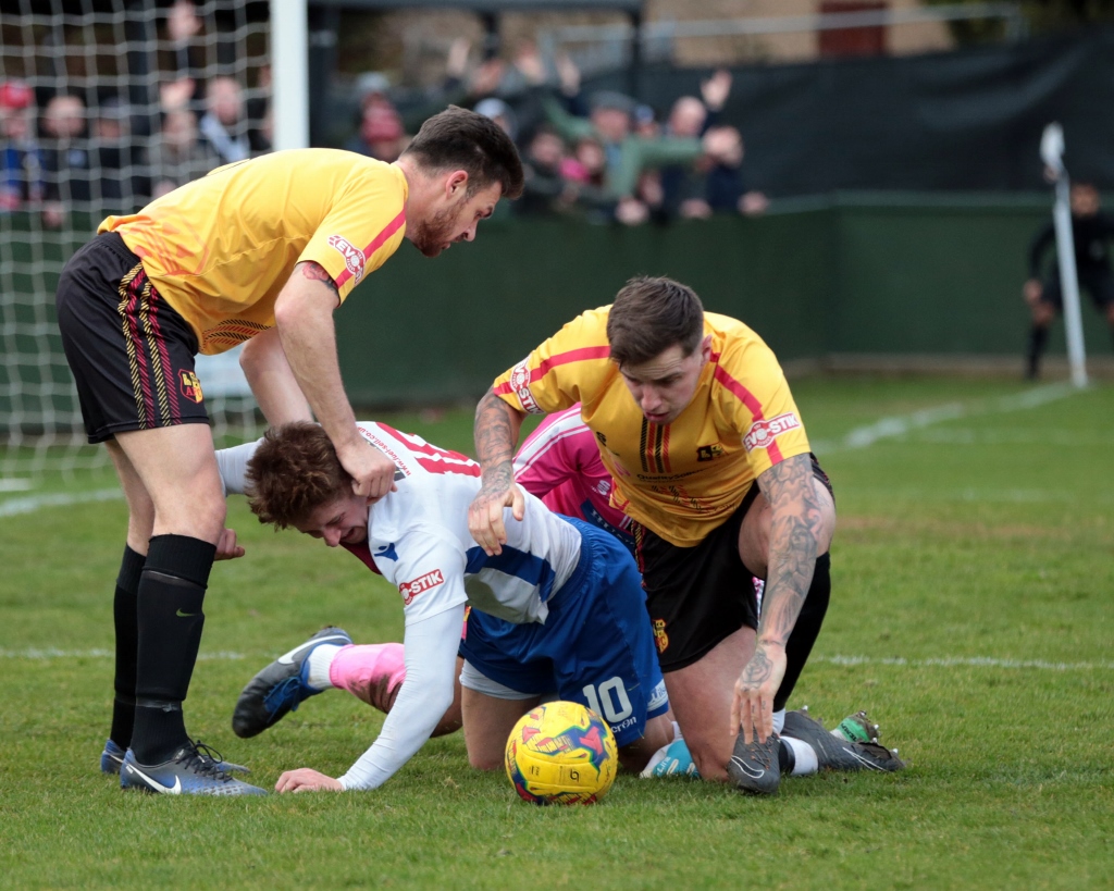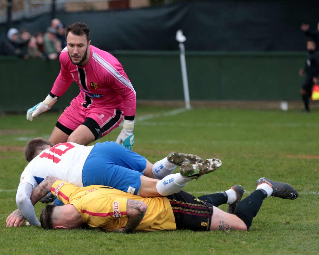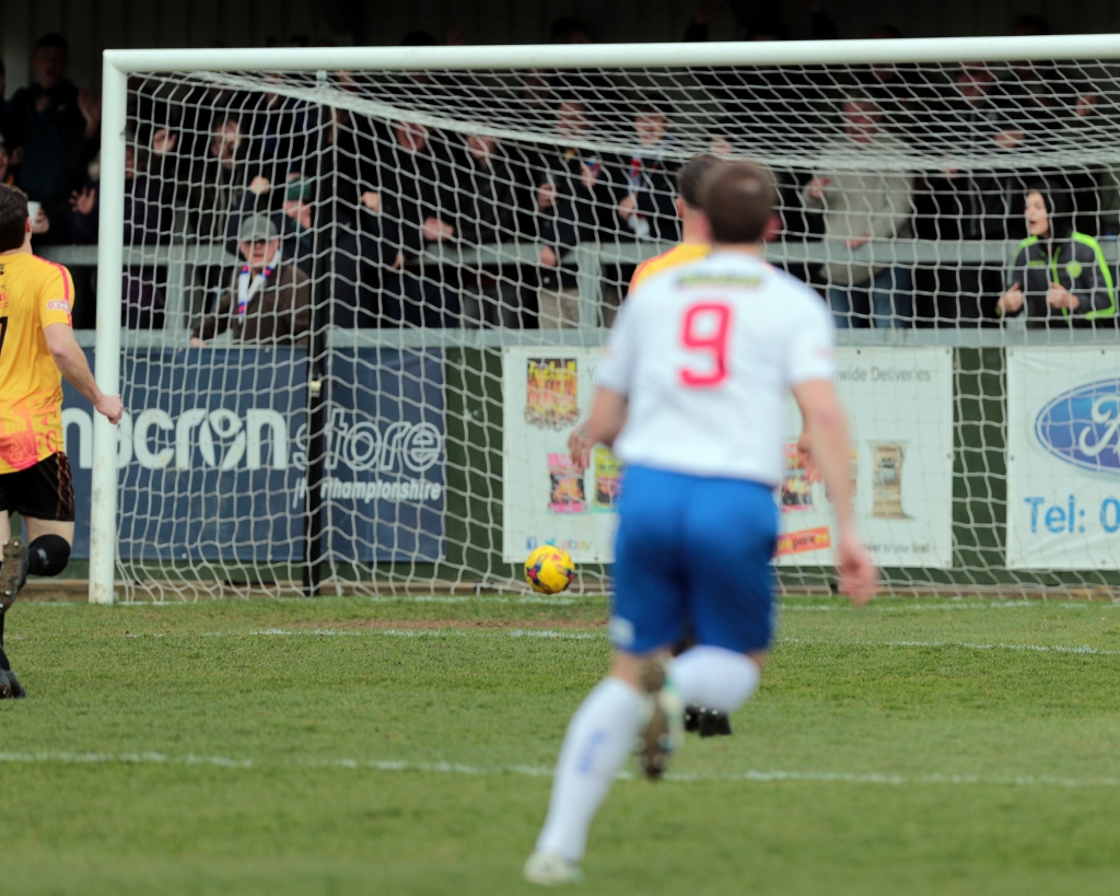 The time ticked down towards the end of the regulation 90 minutes, but there was still time for a final piece of big drama. Rushden won a throw-in on the left just ahead of the halfway line, and Brown took it quickly into the chest of Lorraine down the line. The striker brought it down and then flicked a pass back into the path of Brown before he in turn played it into the area in behind Ashley Carter for Diamond to run onto. Crane came out looking as if he would collect, but Carter took a touch leaving the keeper stranded on the floor. The defender went down himself, and Diamond attempted to get onto the loose ball. However, Carter put his body over the ball to stop the home striker getting onto it, and Diamond went down as he tripped over Carter’s leg and body. There were arguments for a foul, obstruction and even handball, and loud protestations rang out for a penalty. The referee was perfectly positioned to view the incident, but the emphatically waved his arms in a sweeping motion and turned down the appeals.