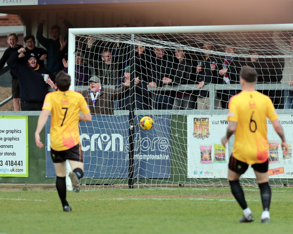 Less than two minutes had been played when Rushden forged ahead. A ball was played into the feet of Lorraine on the right, and he flicked a pass that fortunately ricocheted off David Bellis and into the path of Sam Johnson. He sprinted towards the area, got past a defender and, just as he entered the box, he slotted a low finish past ex-RDFC keeper Dan Crane and into the far corner of the net. It was a terrific run and finish by the winger for his third goal of the campaign, and it gave the hosts the perfect start.