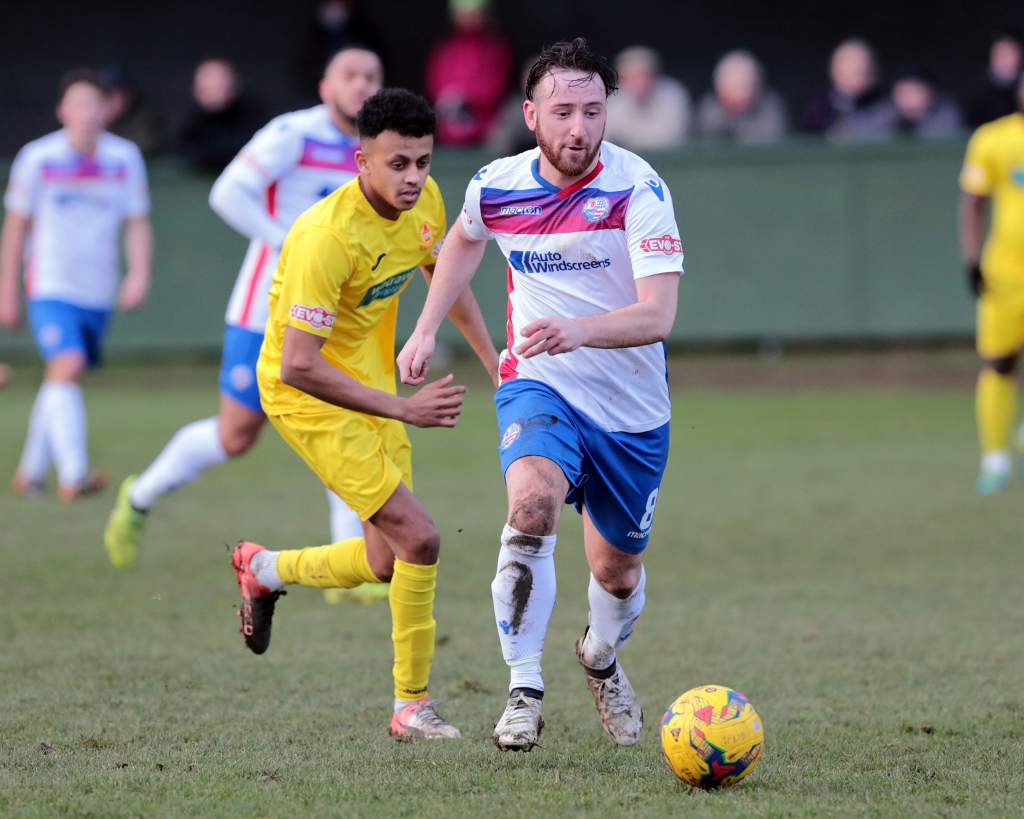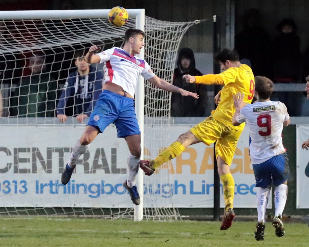 A minute later the visitors launched another attack, and Ravin Shamsi got into the left side of the area before striking an effort towards the near post from a very tight angle, Heath was alert to the danger and parried the effort away before it was cleared upfield. The home side hadn’t been able to get a foothold in the game up to this stage as Banbury, nicknamed The Puritans, were seemingly first to every loose ball and were a threat in behind with runners from midfield and a strong, pacey three-pronged attack. In the 10th minute Liam Dolman was forced to block a dangerous goalbound effort towards goal from in the area, and a minute later Nathan Hicks was required to do exactly the same thing as he charged another attempt down.