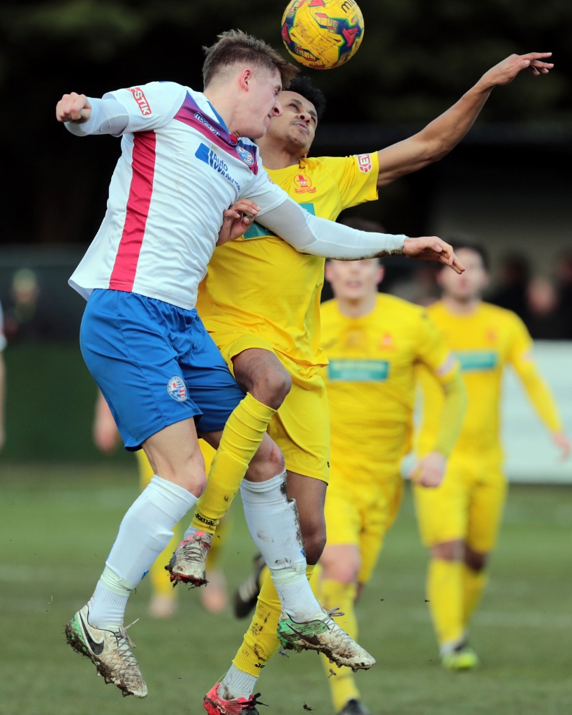 A minute later Banbury came close to a leveller. A lofted ball over the top of the home backline found Shamsi through on goal just inside the area, but the bouncing ball wouldn’t sit down ideally for him and so his resulting effort was weak. It was blocked by Heath, and the keeper was then able to dive and hold onto the loose ball. Shortly afterwards the hosts were on the attack, and a Reynolds cross in from the right towards Farrell was headed up and across the box by Wise. It fell for Lorraine who caught a volley flush and perfectly, but the thundering effort flashed wide of the far post and out for a goal-kick.