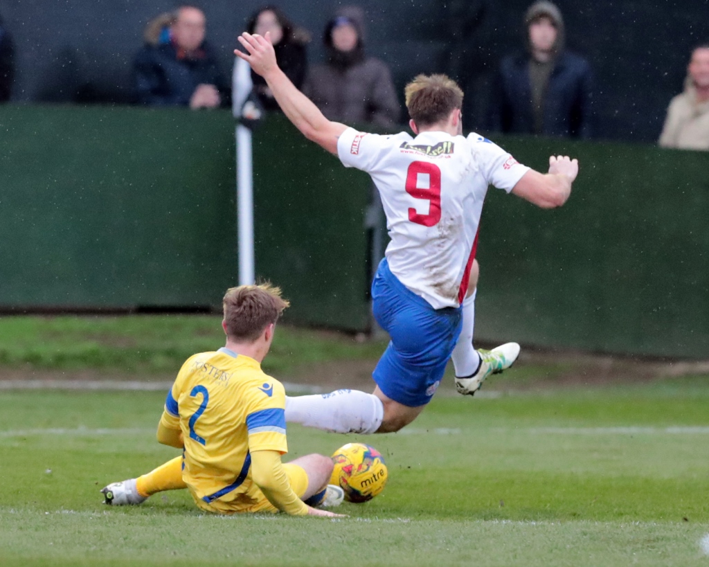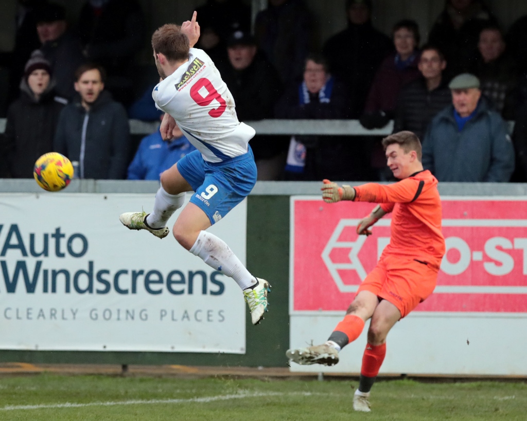 The match entered stoppage-time at the end of the half, and it appeared that Lowestoft would hold a merited lead heading into the second period. However, that wasn’t to be the case. A bouncing ball in behind the away defence was latched onto by Diamond in the area, and he was fouled as he looked to race in on goal. The referee showed no hesitation in pointing to the penalty spot, and regular taker Ben Farrell stepped up. He hit an effort to the keeper’s right and, despite Johnson going the correct way, the effort beat him as it flicked off the post and into the back of the net. It was the midfielder’s 11th goal of the season, and followed up his two successful penalties in the last home game against Biggleswade.