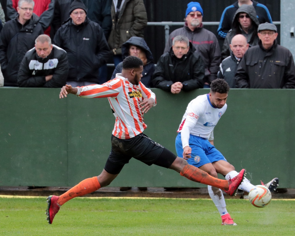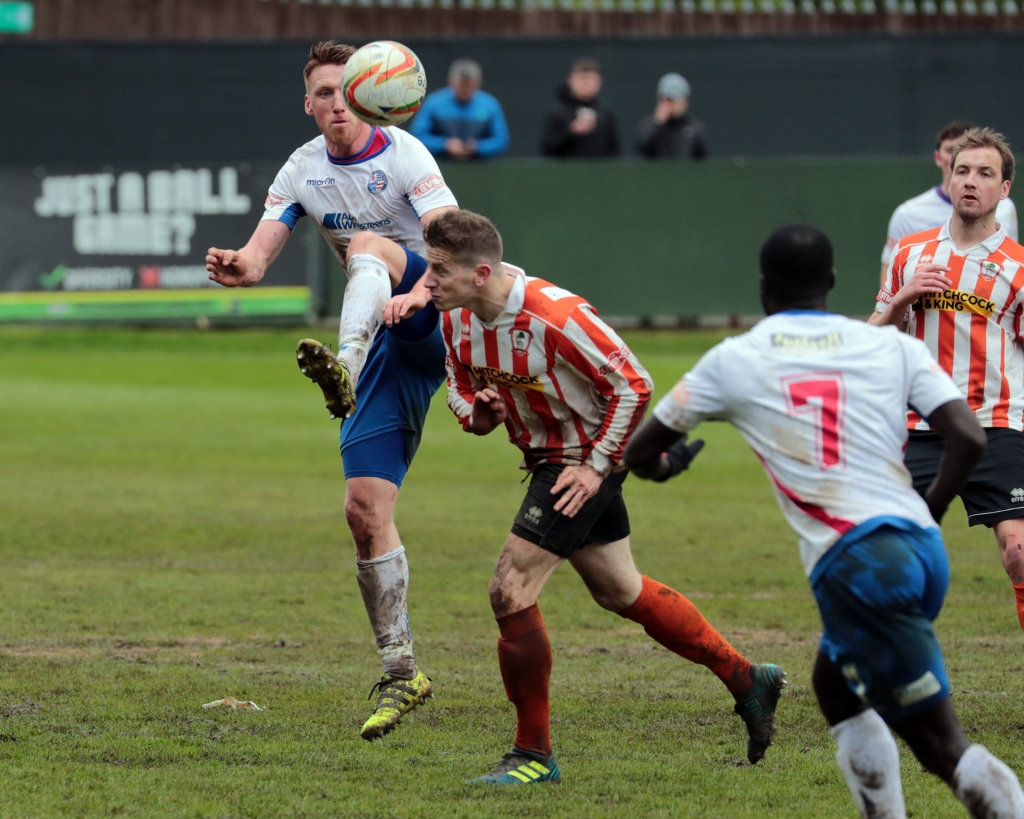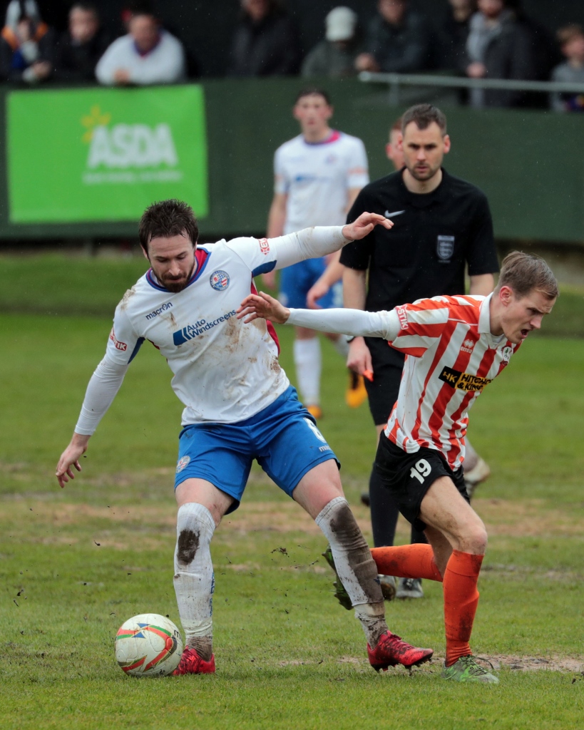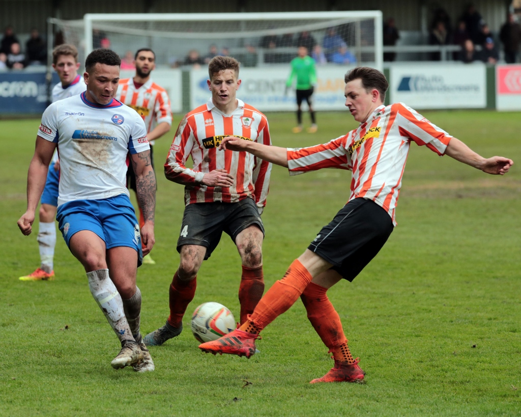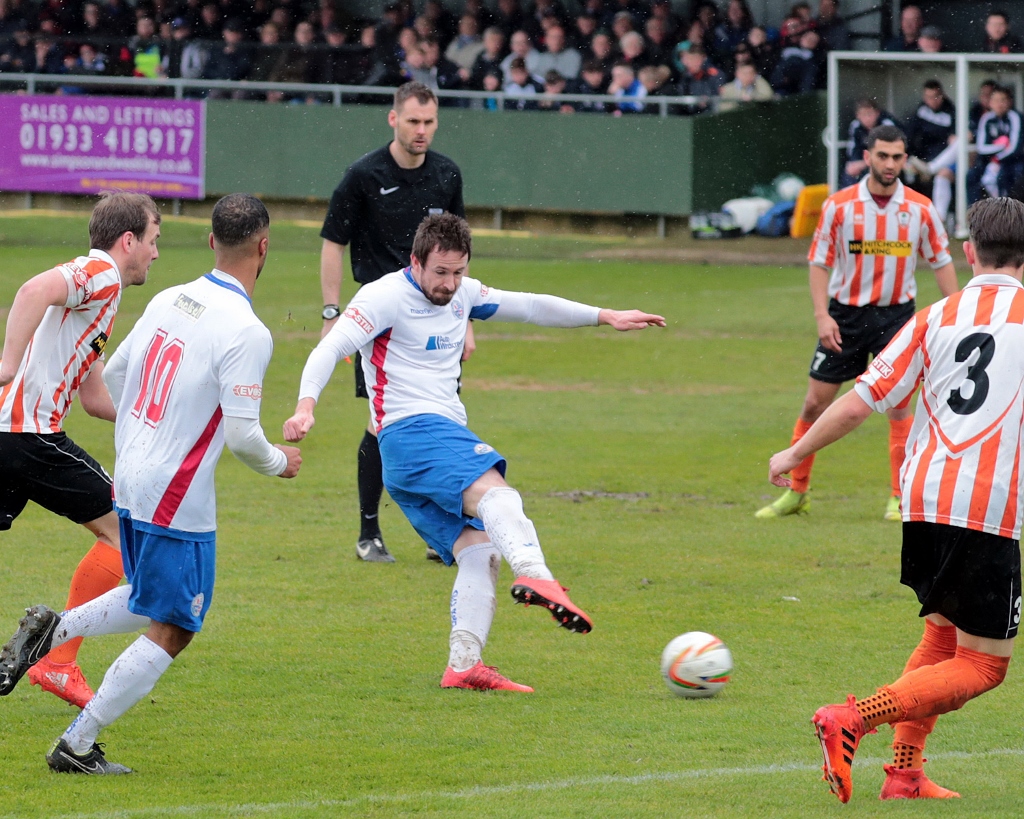 The early exchanges saw the hosts dominate possession mainly amongst the defence and the midfield areas, and they created the first opportunity in the 7th minute. A mix-up in the away defence saw Sam Brown running from left-back latch onto a loose ball and find himself suddenly through on goal, but his effort flew over the bar from the edge of the area. Moments later Ross Oulton tigerishly broke forward before being fouled, but Fairlamb’s inswinging delivery was well headed by an Ashford defender and the danger was cleared. Rushden maintained the early pressure and the quick start, and fashioned another opening shortly afterwards. A dangerous cross in from the right by Blaize Punter saw an Ashford head inadvertently flick the ball on before it was booted up in the air by another away defender. It dropped out of the sky for Spencer Weir-Daley to control before it ran for the lurking Oulton, but his shot was dragged and it flashed well wide of the far post.