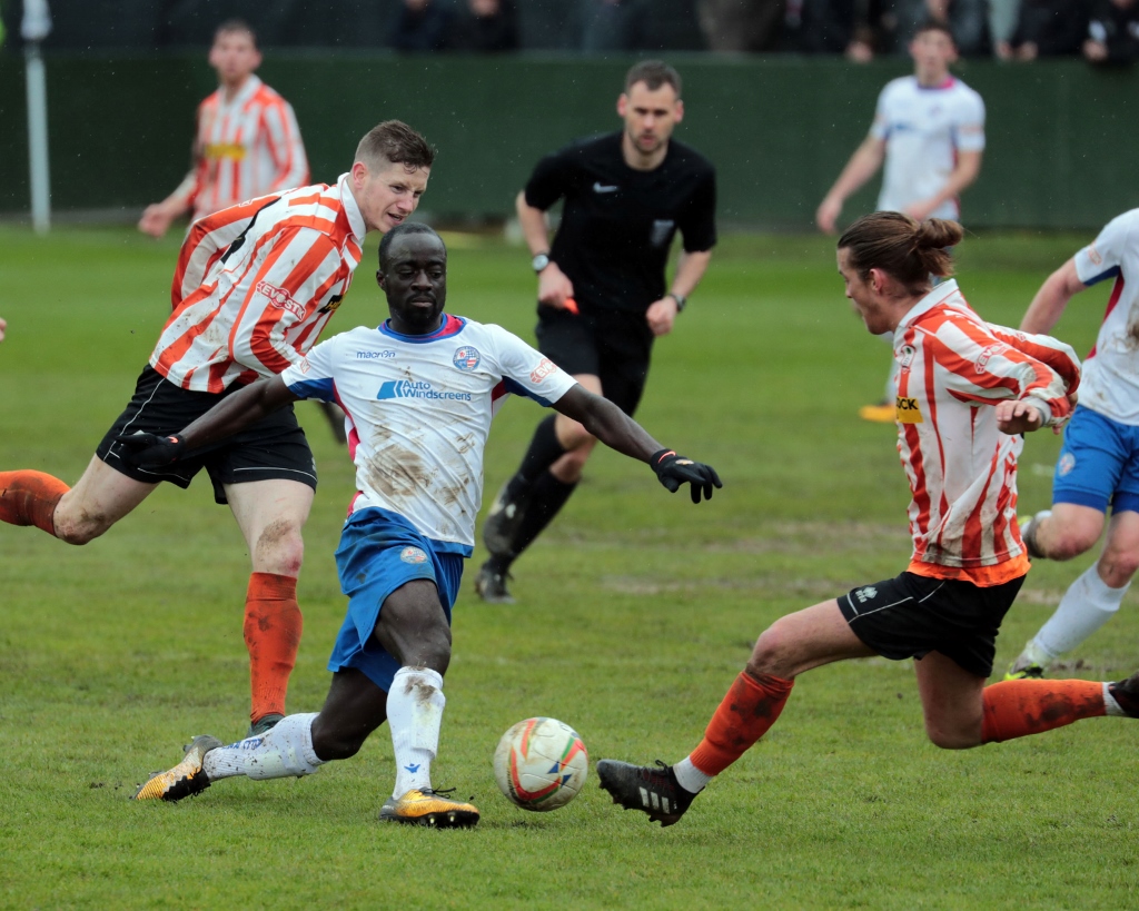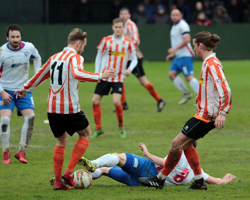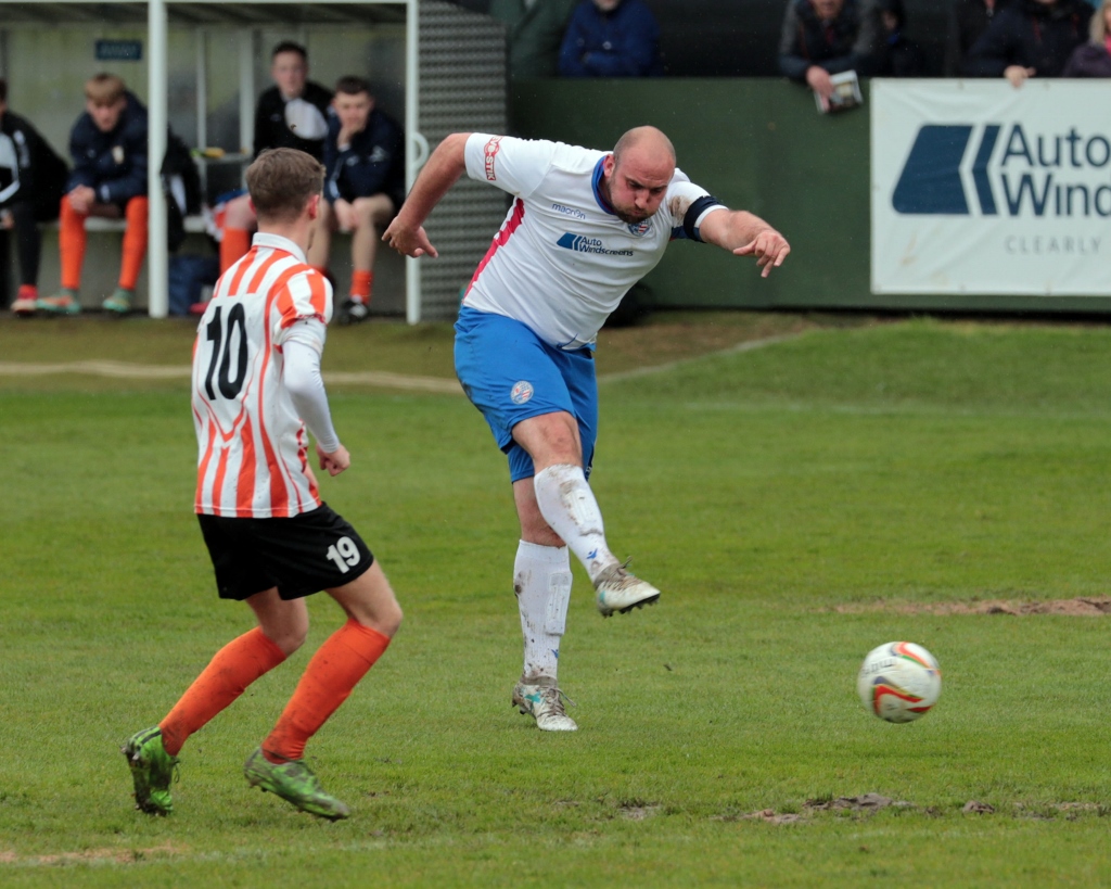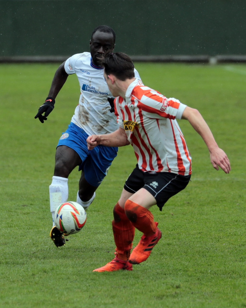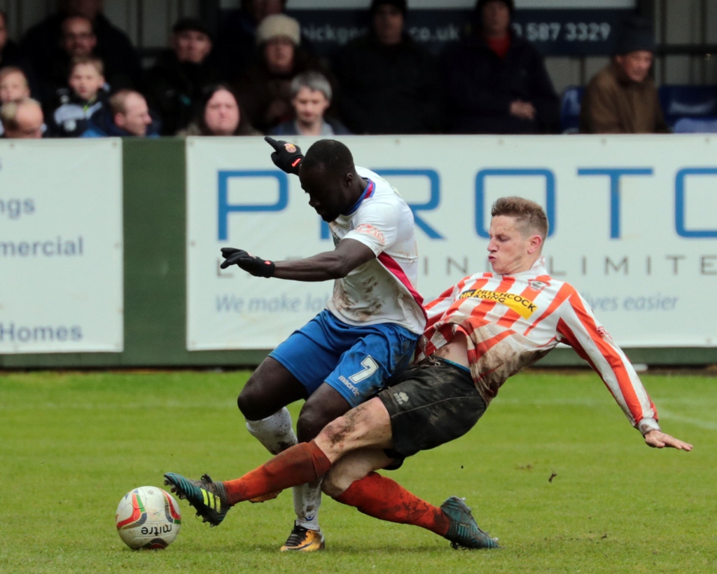The early exchanges saw the hosts dominate possession mainly amongst the defence and the midfield areas, and they created the first opportunity in the 7th minute. A mix-up in the away defence saw Sam Brown running from left-back latch onto a loose ball and find himself suddenly through on goal, but his effort flew over the bar from the edge of the area. Moments later Ross Oulton tigerishly broke forward before being fouled, but Fairlamb’s inswinging delivery was well headed by an Ashford defender and the danger was cleared. Rushden maintained the early pressure and the quick start, and fashioned another opening shortly afterwards. A dangerous cross in from the right by Blaize Punter saw an Ashford head inadvertently flick the ball on before it was booted up in the air by another away defender. It dropped out of the sky for Spencer Weir-Daley to control before it ran for the lurking Oulton, but his shot was dragged and it flashed well wide of the far post.