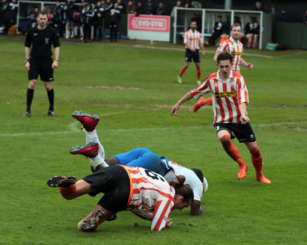 Manager Andy Peaks named an unchanged starting XI to the one that had sealed promotion on Tuesday night by thrashing Aylesbury FC at Hayden Road. The only change came amongst the substitutes as Joe Curtis returned to the bench alongside Jack Ashton, Ben Ford, Tom Lorraine and Ben Diamond. Before the game began the Supporters Player of the Season was announced, with Liam Dolman in third place, Luke Fairlamb in second and Ben Farrell being named in first place to win the award; in a season of high achievement there were many candidates for the award, but with eighteen goals and countless impressive and influential performances then Farrell was a popular choice amongst many.