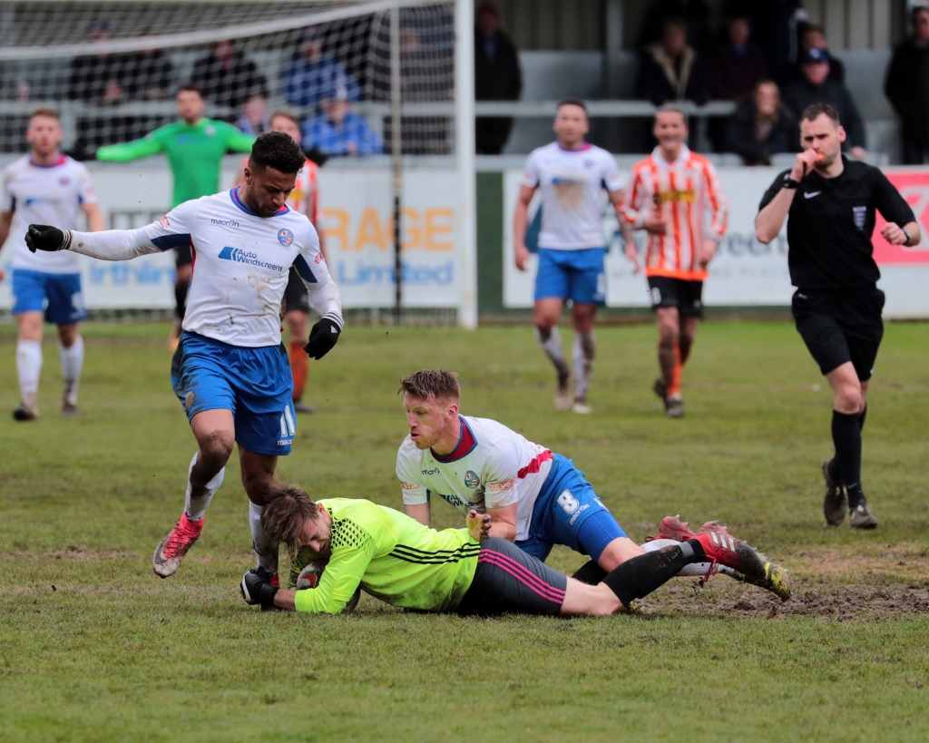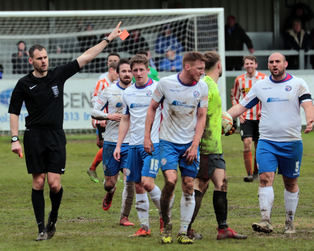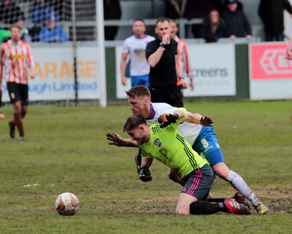 A minute later the hosts made their final change as Ben Ford entered the fray to replace Gyasi, and the time continued to tick down as the end of the contest quickly approached. Still Beaconsfield led Marlow 1-0 as stoppage-time arrived, and one final moment of action presented itself. Ashford won a corner on the left, and they piled the area including goalkeeper Tobin who sprinted forward in an attempt to net a late equaliser. However, the delivery was cleared upfield by Diamonds and the ball broke towards the halfway line as Tobin still was attempting to hare back to his goal. He and Farrell challenged for the ball and, as it ricocheted away and looked like the home midfielder would latch onto the loose ball, the keeper jumped on the ball and held it to his grasp. The referee blew straight away and ran across to brandish a red card, with Tobin swiftly making his way off the pitch and captain Russell Canderton pulling on the keeper’s jersey.