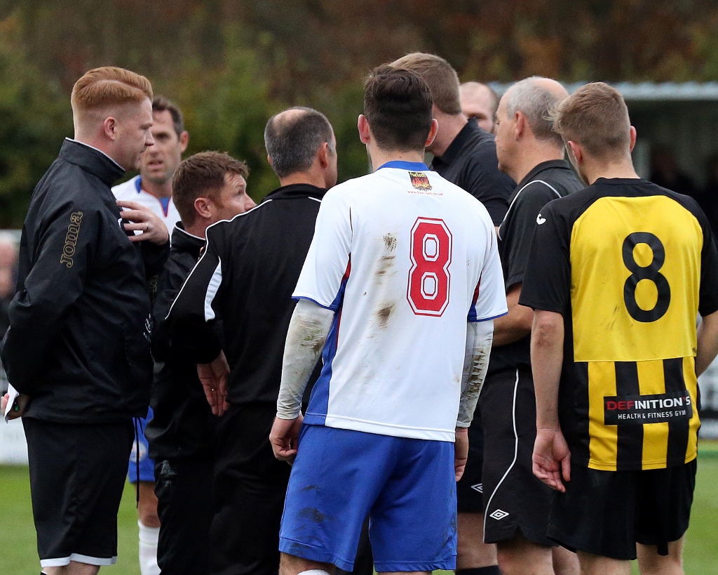 `Tigers` Daniel Spencer was given a yellow card right at the end of the game after an unsavoury assorted melee of players and management officials threatened to undermine what had been a highly competitive and entertaining game of football.