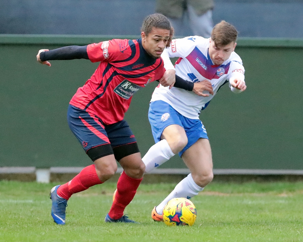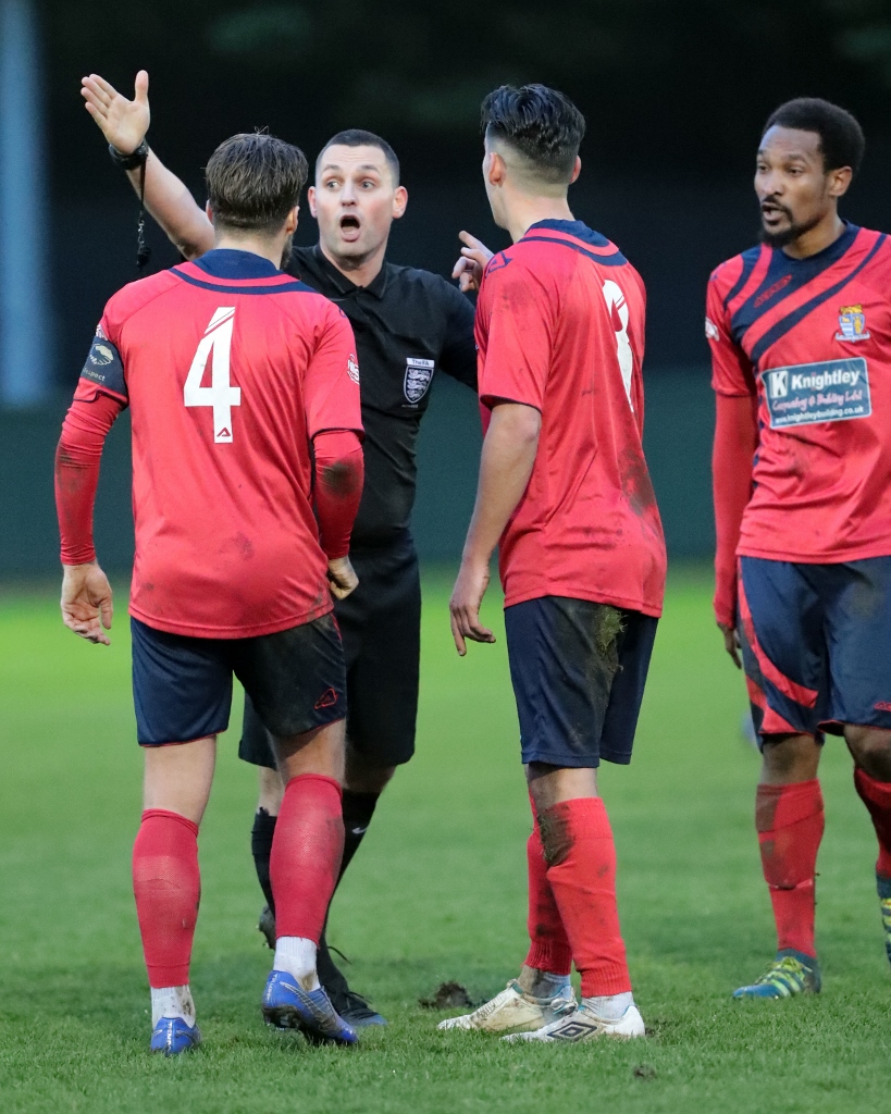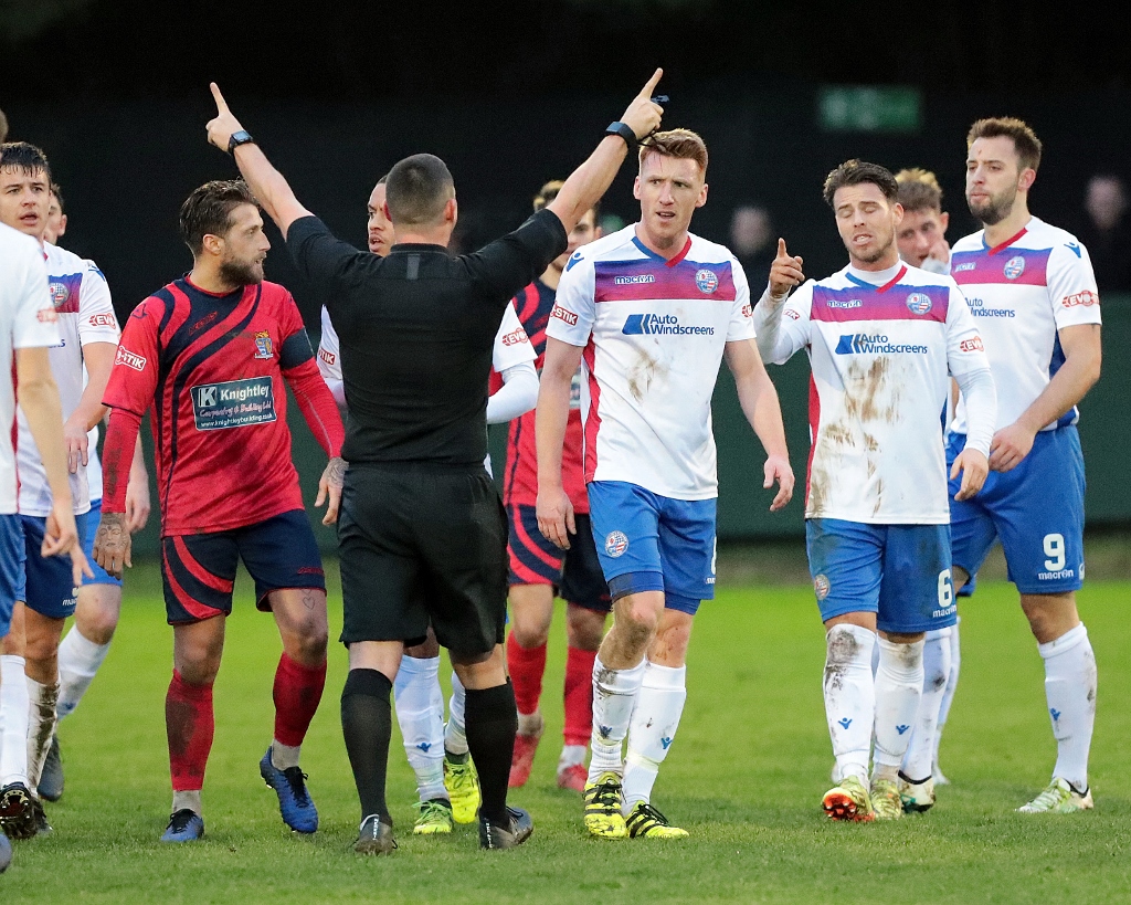 The opening half was relatively quiet with both sides struggling for consistent possession and pressure, and clear-cut opportunities were in short supply as a result. For the visitors Jordan Norville-Williams fired just over from range in the very first minute, and Diamonds responded with Ben Diamond’s header flashing across the box and an Alex Collard lob dropping onto the roof of the net. St Neots should have led in the 20th minute when Taylor Parr crossed from the right for ex-Diamonds man Nabil Shariff to head goalwards from close range, but it went over the bar. Diamond then had a header comfortably saved down the other end before away defender Ryan Hughes saw the same outcome moments later. A number of half chances were being created with Diamond then seeing a goalbound volley blocked, Albie Hopkins being denied by another block and St Neots’ striker Dylan Williams also having an attempt charged down from inside the area. All the action was saved for the final five minutes of the half though as, firstly, Diamonds took the lead when Tom Lorraine impudently flicked home from close range, and a minute later Saints midfielder Tom Wood was shown a red card for a studs-up challenge on Ben Farrell.