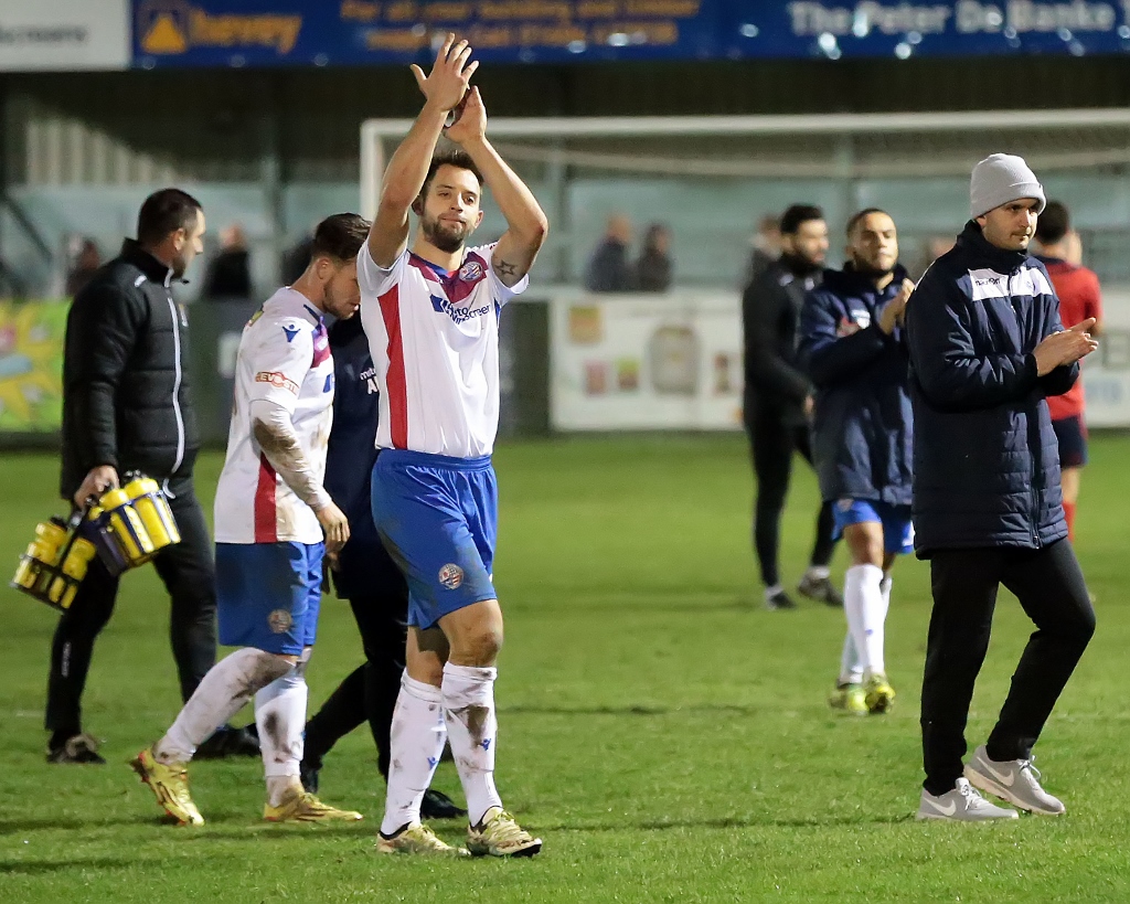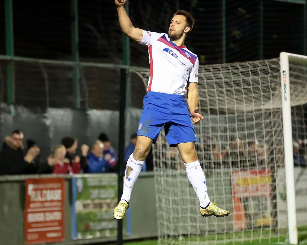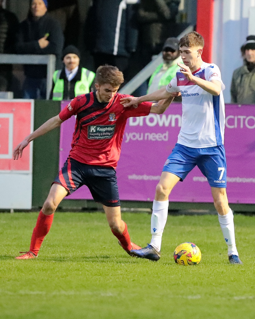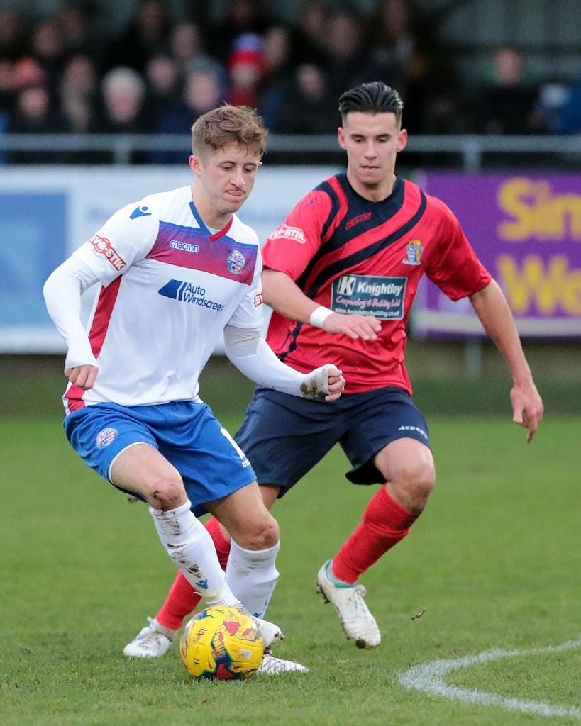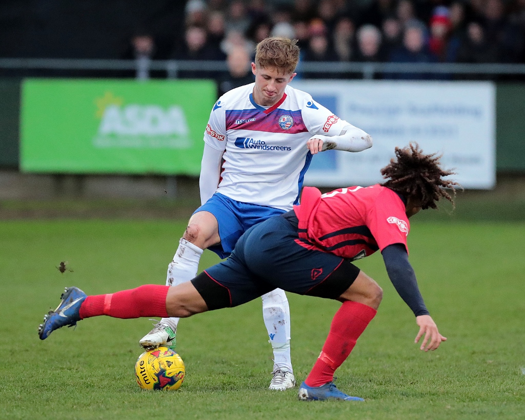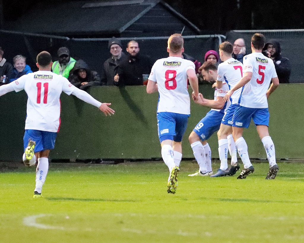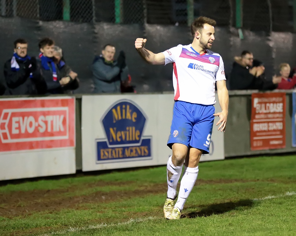 Soon afterwards, Diamonds took the lead. They won a corner on the left, and Rogers’ drilled delivery found Hopkins whose downwards header ran towards goal. It bounced off a St Neots man and ran for Diamond to nudge it across to Sam Brown on the right of the box. He fired it across, and there was Tom Lorraine a few yards out to impudently flick an effort past Norville-Williams on the line and into the back of the net. It was the striker’s twelfth goal of the season, and came at a crucial time just before the half-time interval.