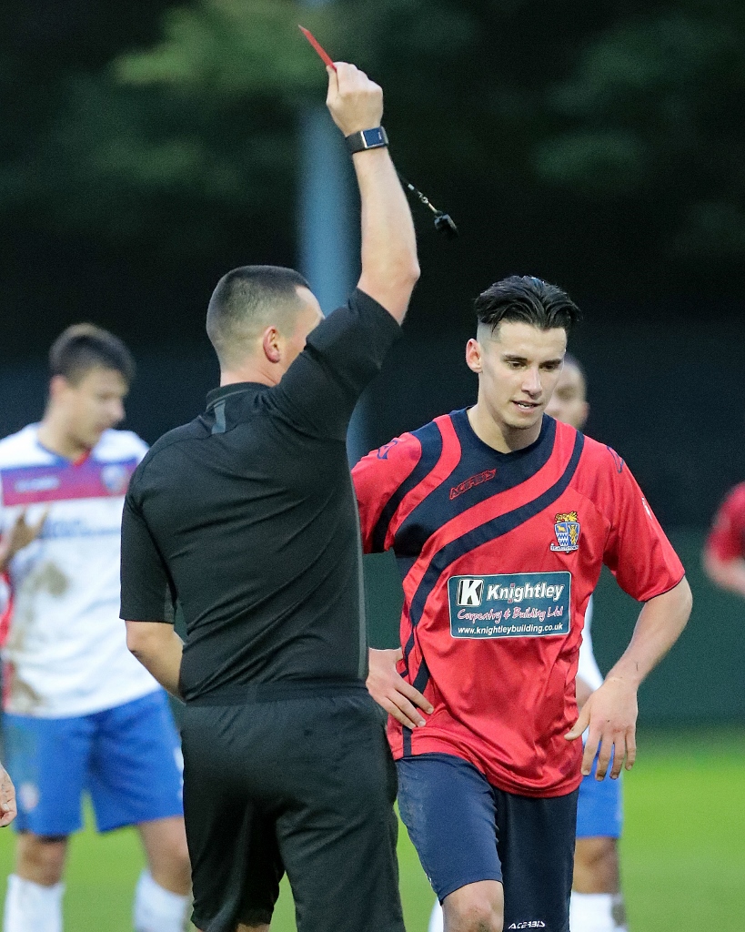 A minute later it got even better for Diamonds as the visitors were reduced to ten men. A long ball towards the Diamonds left-back area was headed away, but Tom Wood nipped ahead of Farrell to get onto the loose ball. His touch was slightly heavy though and he slid in on Hicks to win the ball, but his studs were raised in the challenge. The referee blew immediately and, after a few moments of deliberation, brandished the red card in Woods’ direction.