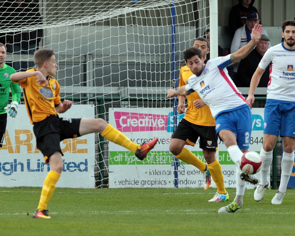 Diamonds pressed in the early stages with Nic Evangelinos coming close twice firing just wide left from the edge of the area and then seeing his effort from a similar position deflected up over the keeper also just over the bar. Nabil Shariff also came close to connecting with a bouncing ball in the box in just the first minute and then did connect to prod over the away keeper in 21 only to see the ball spin agonisingly wide.