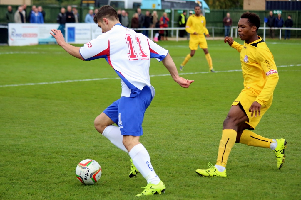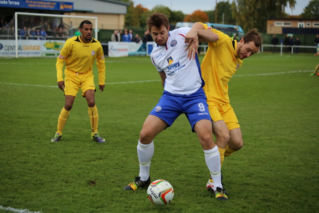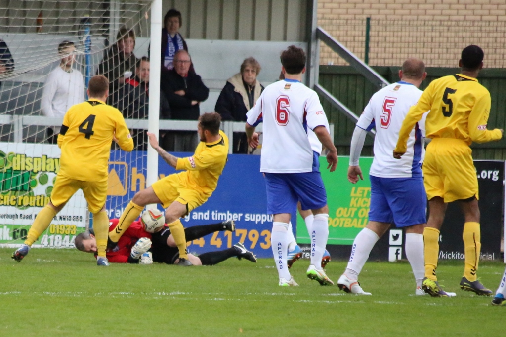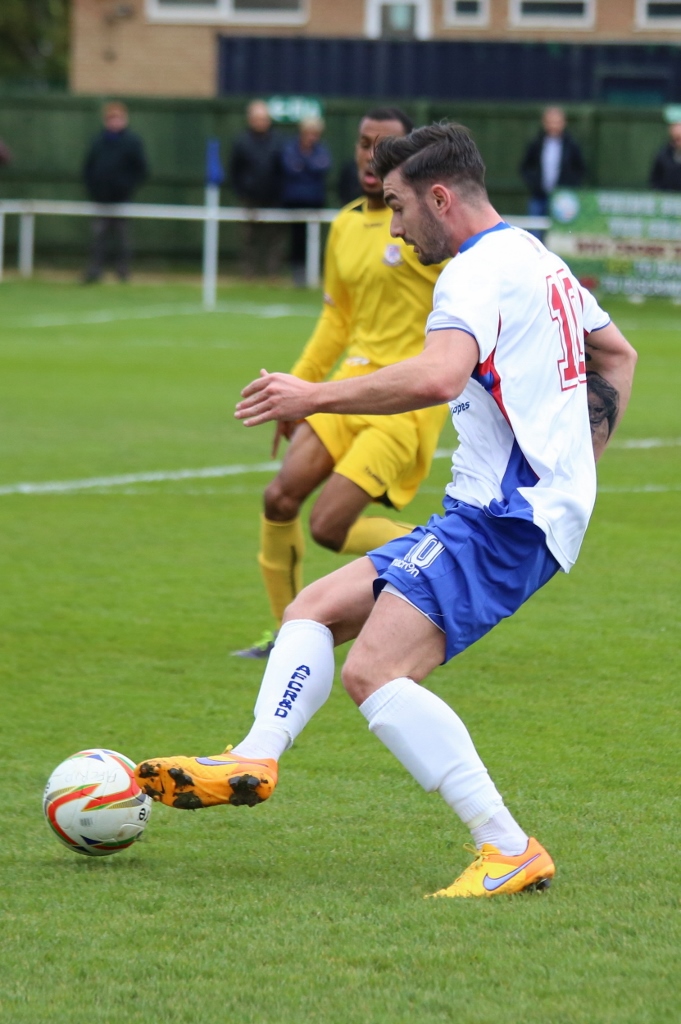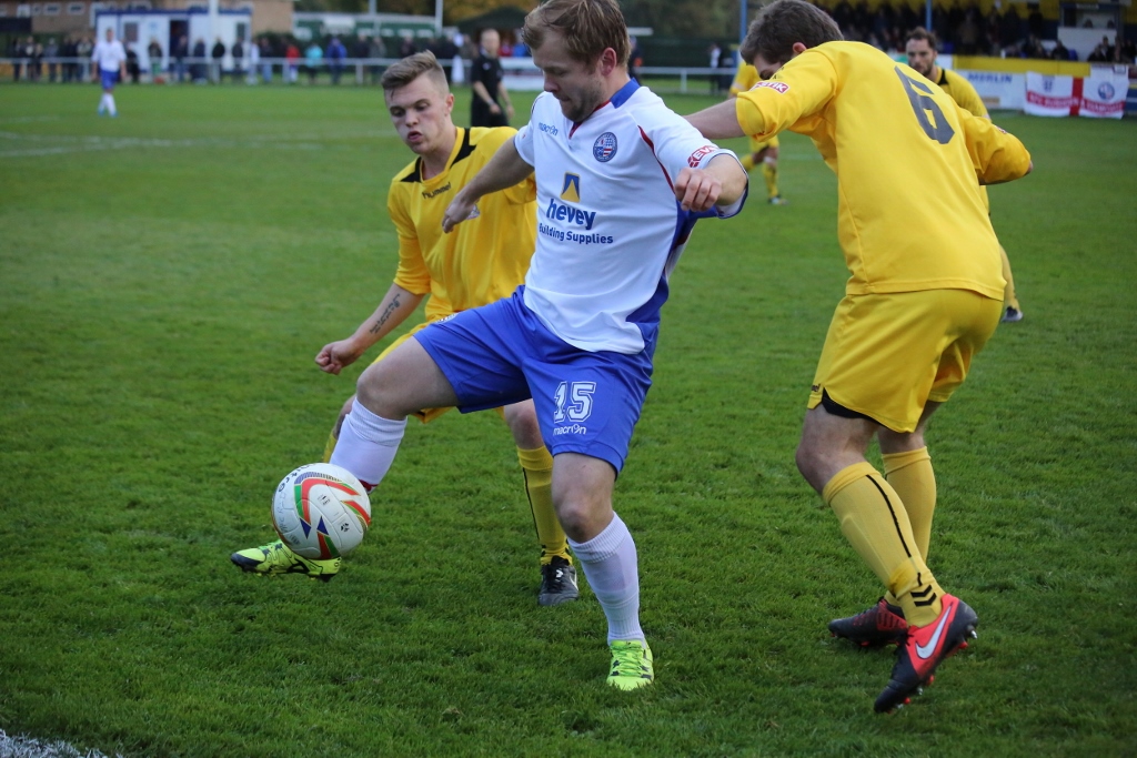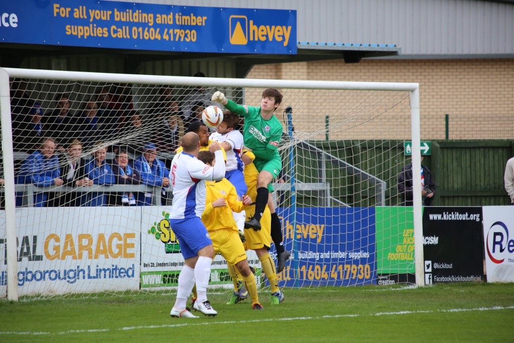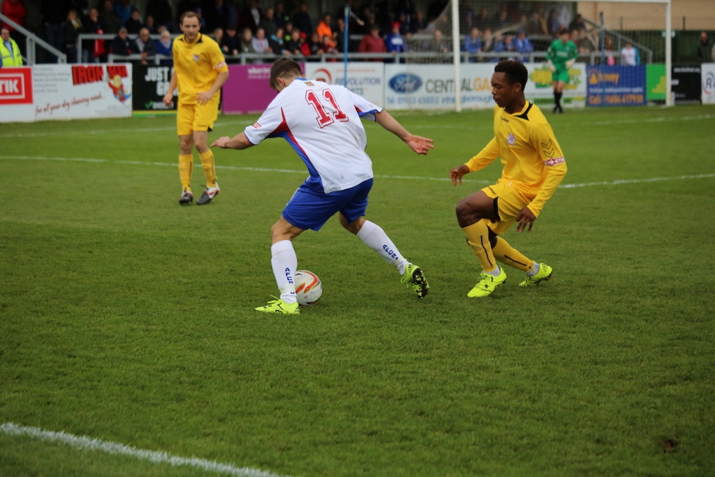 The game was now very much all to play for and the general play started to open up as both teams sensed the chance of a victory. Hoban almost restored the lead six minutes after the leveller as a ball forward broke into the Rushden number 11’s path when the ball was nicked away from Bunting, but his left-footed shot cleared the bar from 20 yards out.