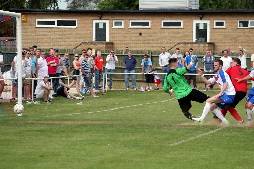 On a hot afternoon both sides contributed to a lively first period, and it was the visitors who had the best of the early exchanges. Dave Goodman was twice able to dissect the Diamonds back four with neat through balls, resulting in good chances for Jordan Cross, but on both occasions Quincy Shorunmu was able to get the better of the situation, palming one effort away for a corner after 14 minutes, and then seeing Freddie Ayears unable to capitalise when he blocked away another Cross effort after 20 minutes.