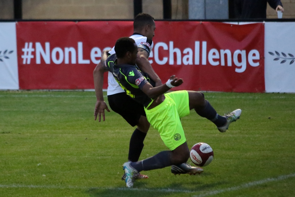 After 41 minutes, Chris Dinnol was gifted an opportunity to double the Diamonds advantage. Fairlamb, rotating wings with Gyasi, found Dinnol with acres of space in front of the Corby goal. But after having almost too much time on the ball, Dinnol’s tame shot was palmed away by Bastock to the relief of Corby fans and the visible despair of the Rushden no. 9.