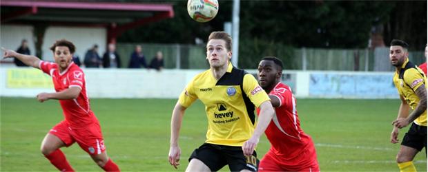 For a brief spell Rushden were galvanised into action, and a couple of surging runs from full-back Kennedy seemed to raise the tempo of the visitors’ play. It was a cross from the on-loan Corby man which found its way to Leslie, and but for a slightly sharper touch the midfielder would have had a clear sight of goal. Another Kennedy cross, this time a deeper one, shortly after found a rising Bowen, but the Egham defence did well again to block the attempt behind for a corner.