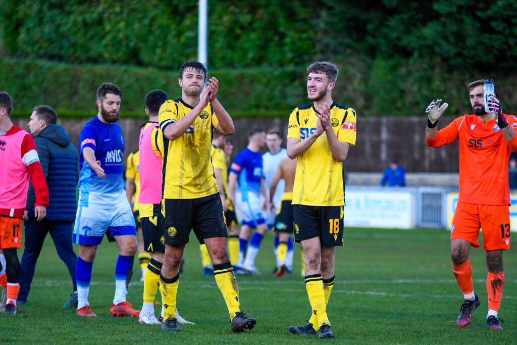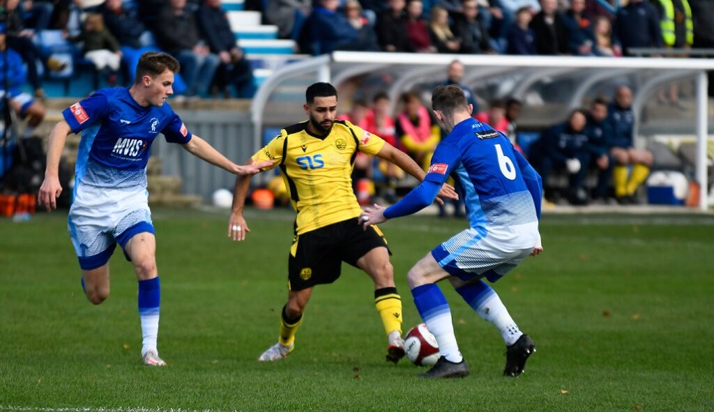 Things settled down for a few moments, but the hosts continued to look dangerous when running at the Rushden defence. One such moment saw the covering Jesse Akubuine penalised for a foul on the edge of the area, though Byrne’s resulting effort was blocked by the away defensive wall. Home striker and captain Liam Hughes then rose highest from another set-piece, but his header floated wide.