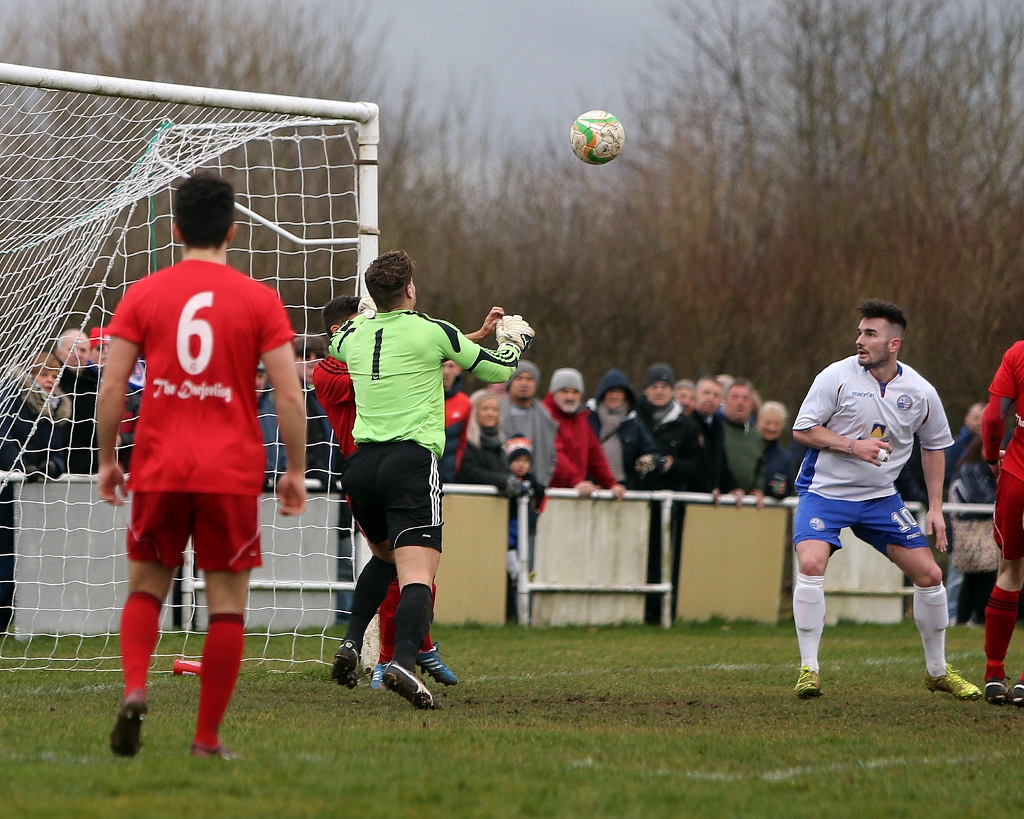 The game started in dramatic fashion with first Richard Bunting having a headed chance from Russ Dunkley’s good run and cross, and then Huntingdon taking the lead all in the first minute. Ben Colmer got ahead of his marker and volleyed superbly into the bottom corner from 10 yards from a hanging right wing cross.