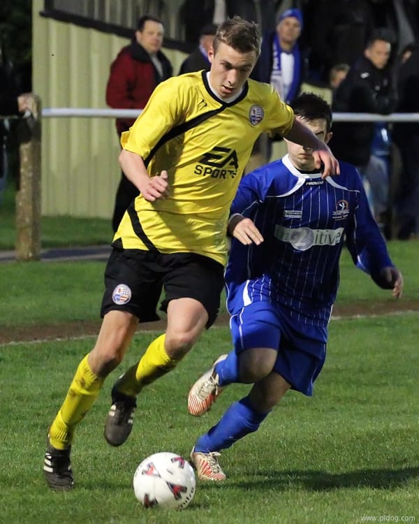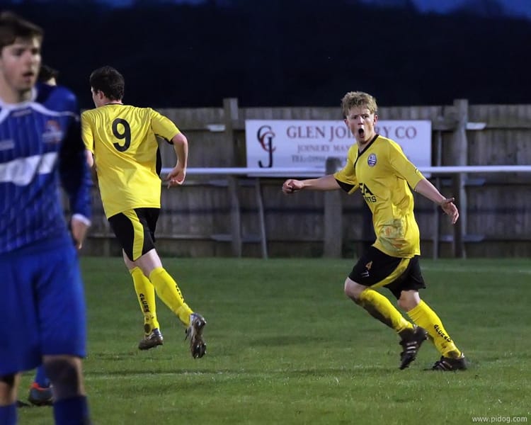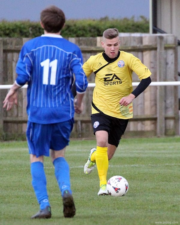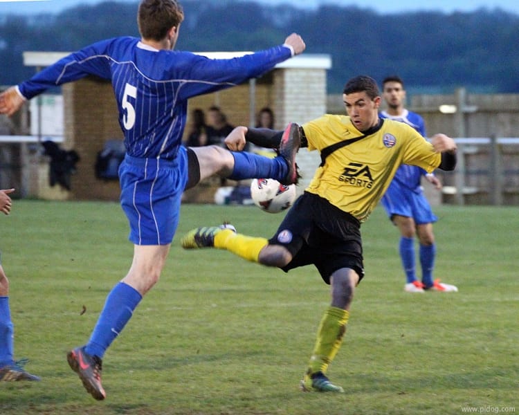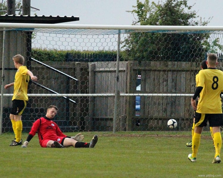 A good attack down the Yaxley right wing saw a low cross played in towards the far post, where Liam Bond controlled the ball just ahead of a Yaxley striker, but with the ball rolling back towards goal, Vitue was quickly off his line to gather it up. However, referee Chris Rath decided that Bond’s touch was a deliberate pass back to his goalkeeper and awarded an indirect free kick to Yaxley, just outside the 6 yard box. The ball was laid off to Sansby whose powerful shot took two big deflections on its way into the back of the net.