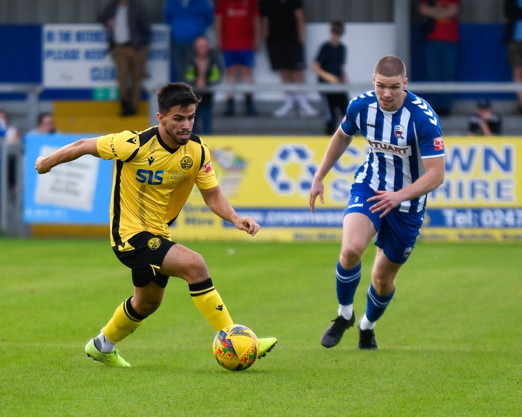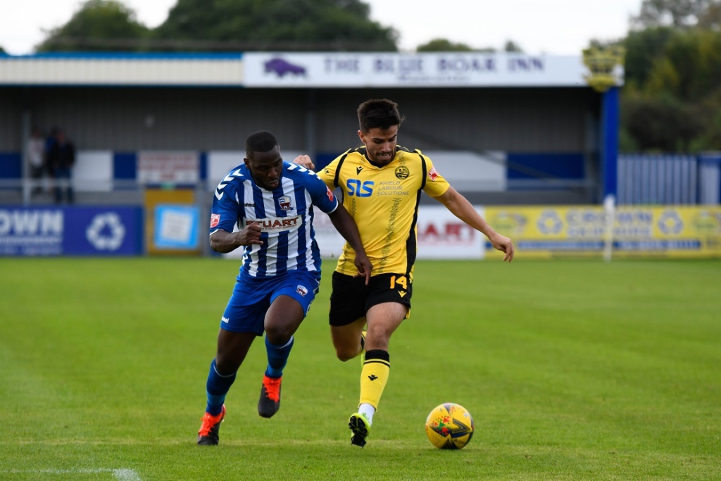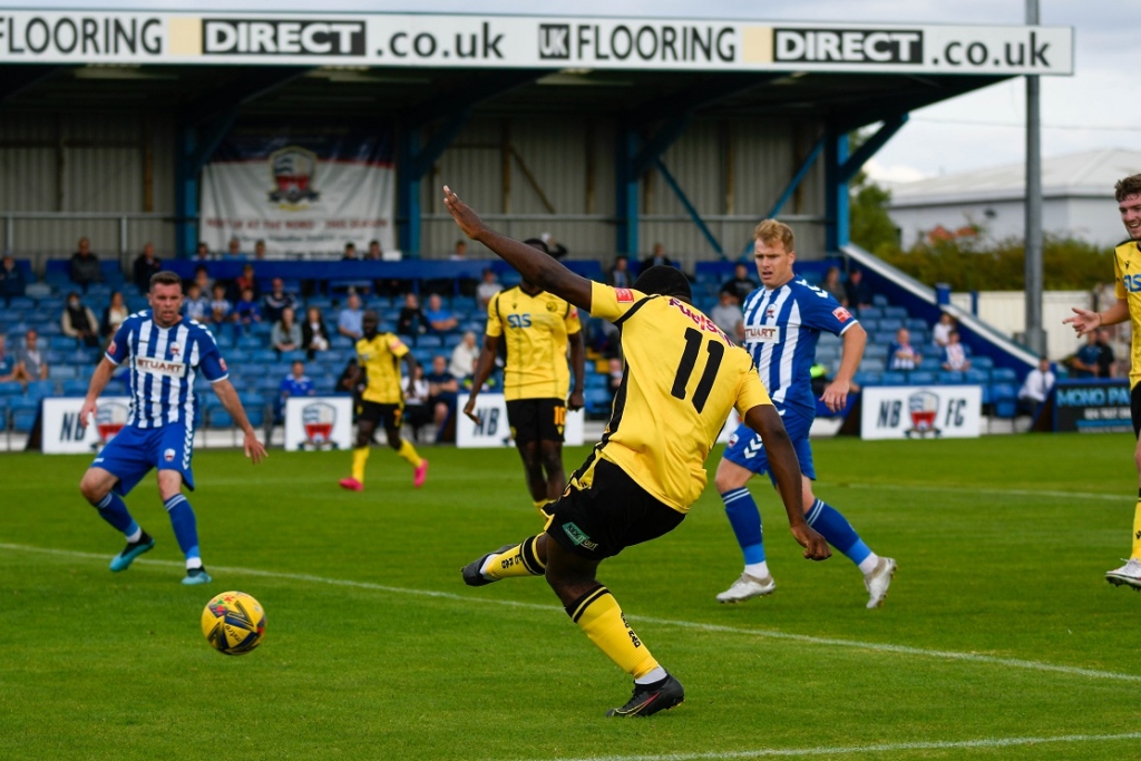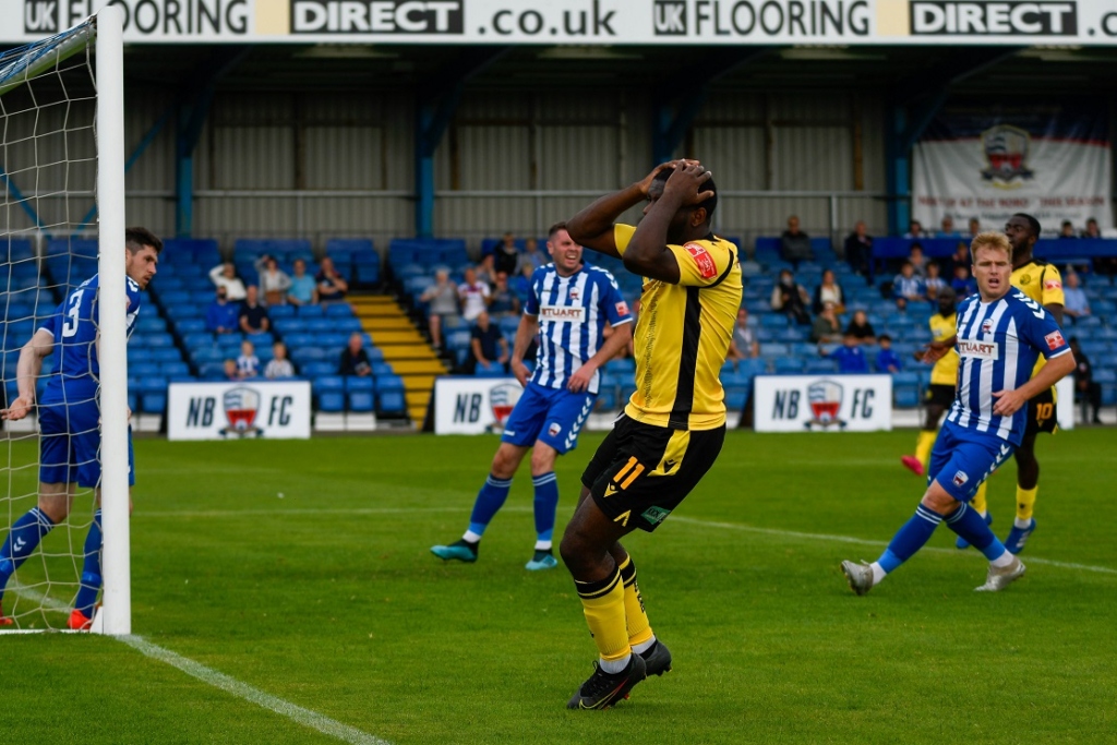 Play continued to switch between either end as the hosts then should have taken the lead. In the 34th minute Carl Baker got down the right and stood up a cross to the back post. It was met with a towering header that seemed like it would find the net, but Casey vitally flicked it away from close to the goal-line. Two minutes later, a cross from ex-Rushden man Callum Westwood found midfielder Cain Noble close in, but his volleyed effort flew off target.