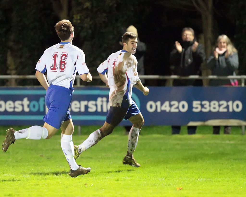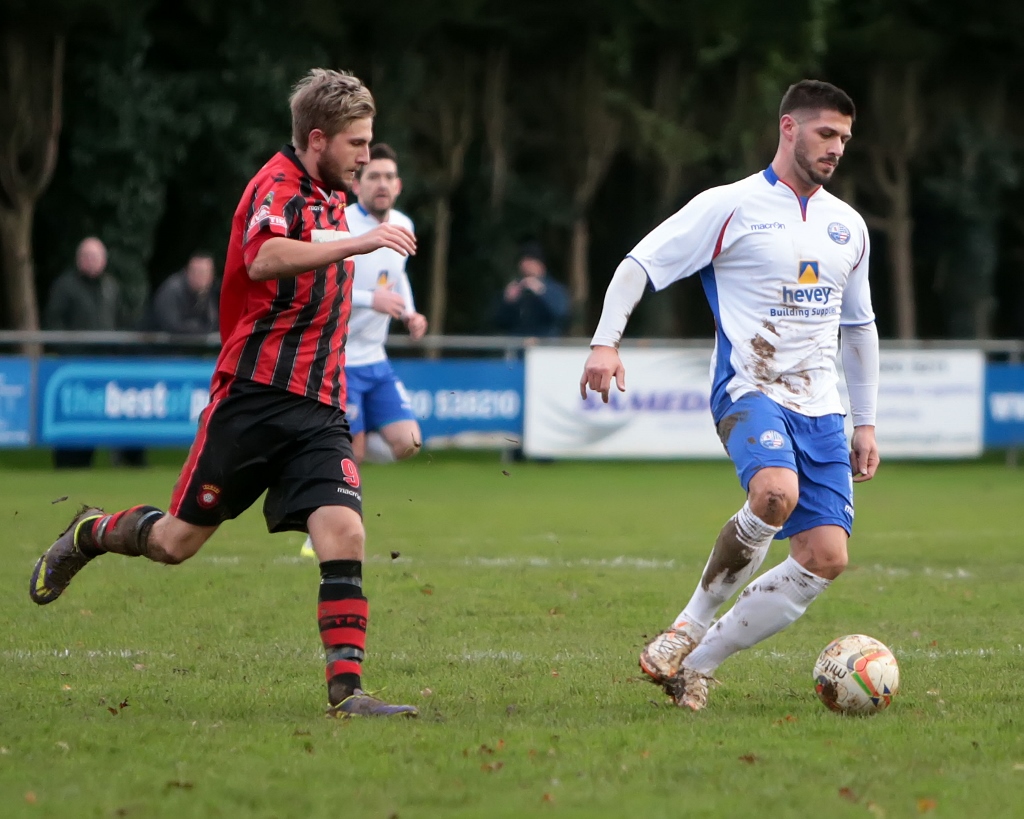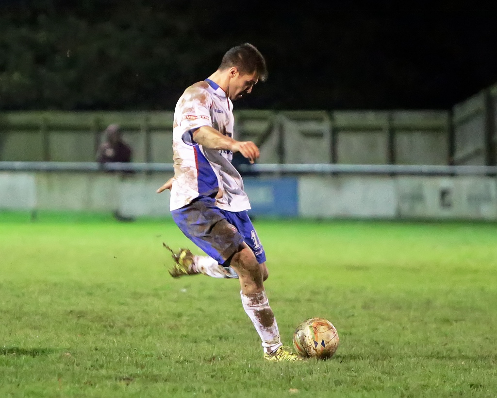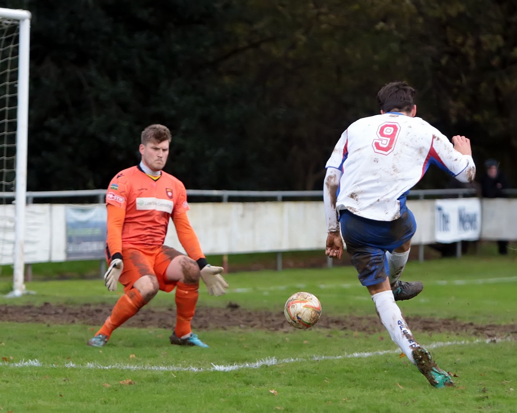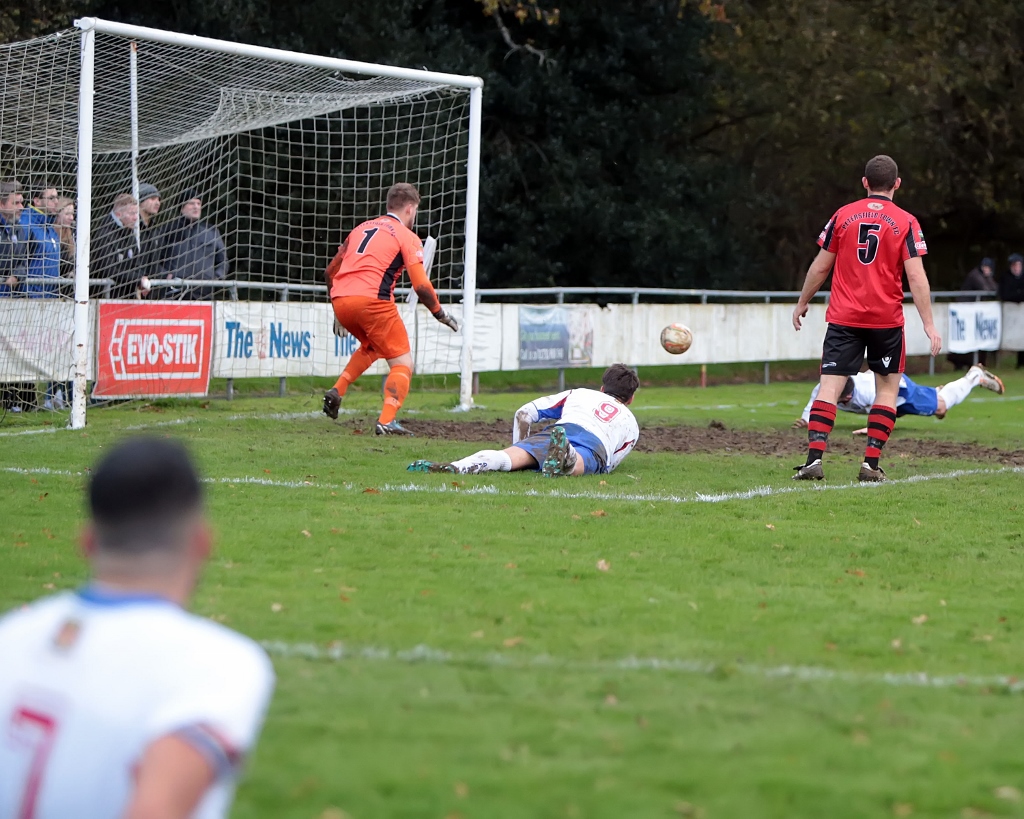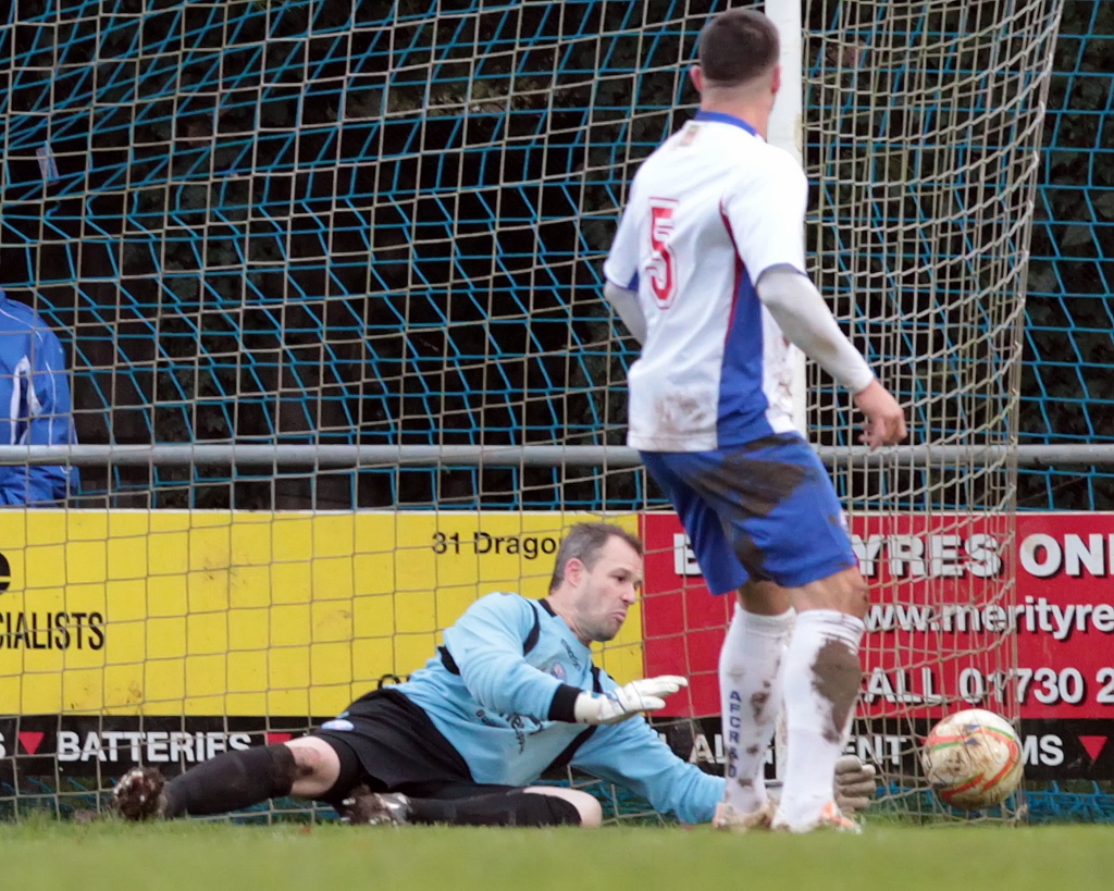 After another pitch inspection had been passed the two sides belied the conditions to provide an entertaining game on a heavy pitch in very windy conditions. Tommy Berwick came close to opening the scoring in just the second minute turning Lewis Leslie’s right wing cross just wide from 8 yards. Tom Liversedge twice and Lewis Leslie also came close when free in the box denied by the excellent home keeper. Matt Finlay made two excellent saves to deny Petersfield in a goalless first but very even first half.