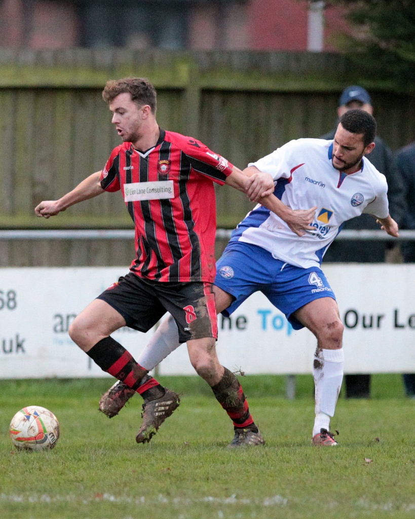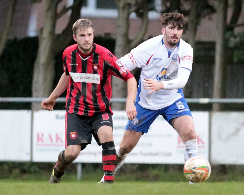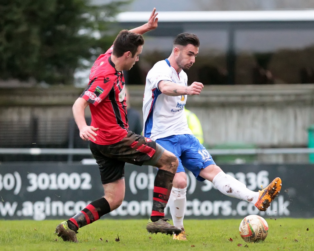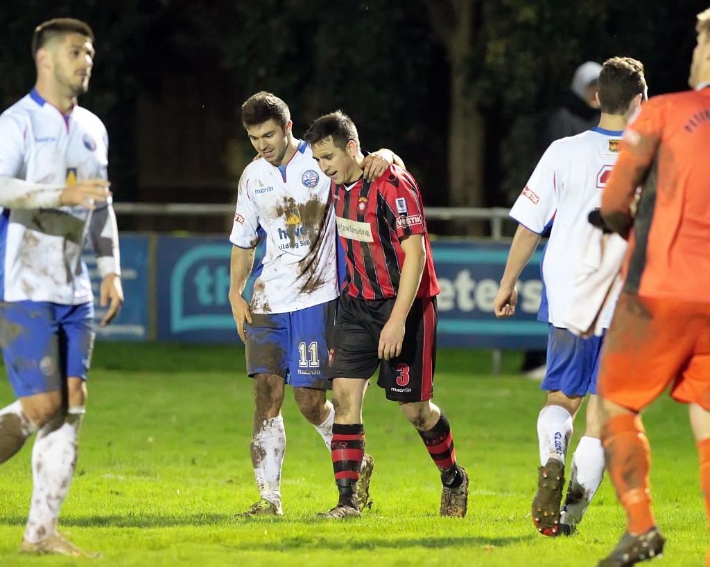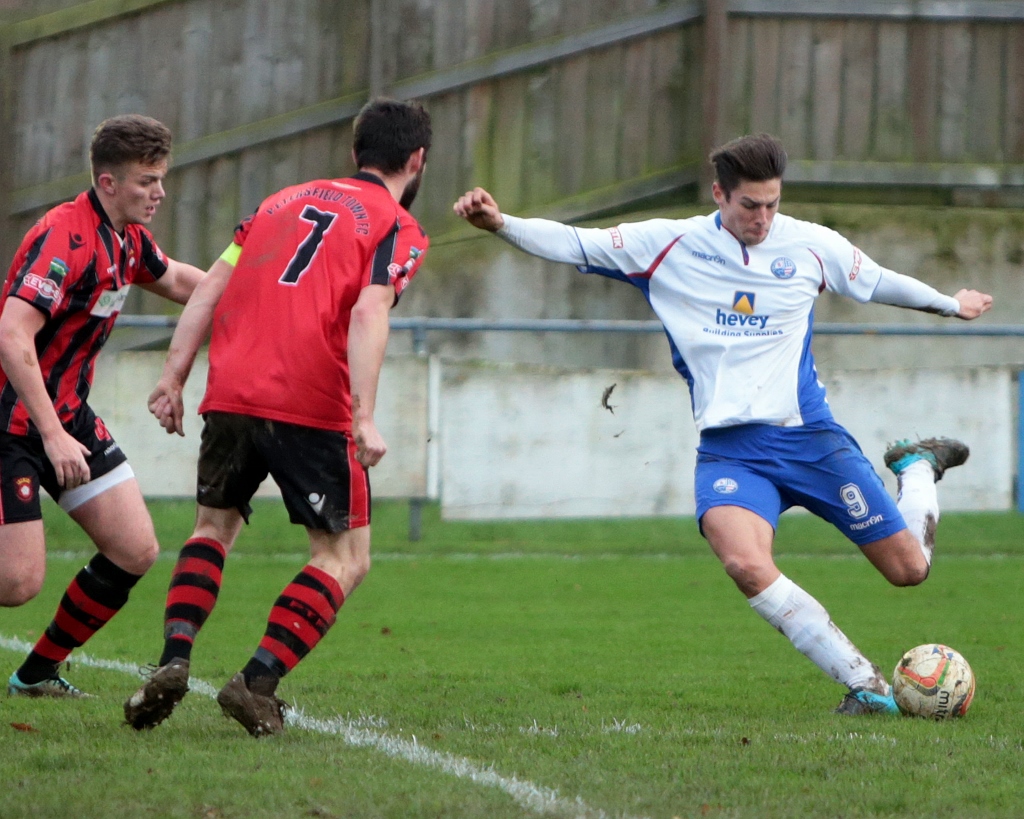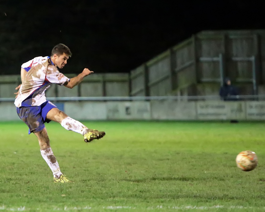 After another pitch inspection had been passed the two sides belied the conditions to provide an entertaining game on a heavy pitch in very windy conditions. Tommy Berwick came close to opening the scoring in just the second minute turning Lewis Leslie’s right wing cross just wide from 8 yards. Tom Liversedge twice and Lewis Leslie also came close when free in the box denied by the excellent home keeper. Matt Finlay made two excellent saves to deny Petersfield in a goalless first but very even first half.