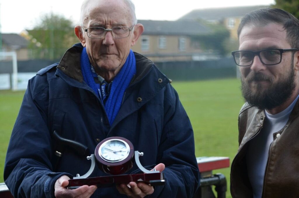 Prior to Saturday’s home match against Royston Town, Rob Usher, Club Chairman, presented Roger Knight with a parting gift.