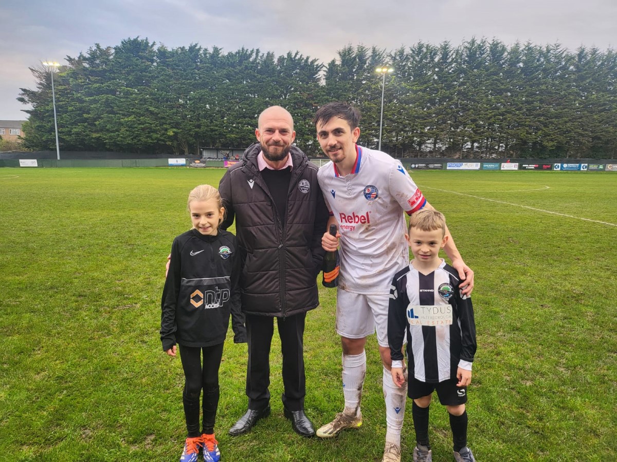 Today’s Man of the Match, Ethan Johnston, presented with a bottle of bubbly by Freya and Jensen, great grandchildren of former Rushden Town United Counties League title winner Ray Clipston.