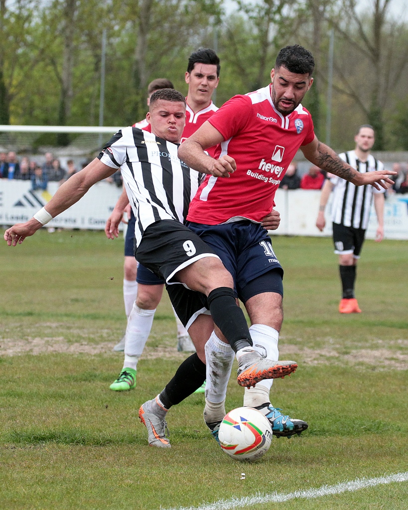 This goal, like in the regular league fixture back in August, came in the 88th minute, and despite Rushden thoughts naturally turning to how close they were to sealing the victory and promotion, they had to rouse themselves and go again. Ives understandably had their tails up on the back of the well-taken leveller, though it was the away side who would have the final two opportunities of normal time. Firstly a Richards deep cross from the right found Leslie at the back post, and his header back across the face of goal was agonisingly too high for the unmarked Harris, and then after Finlay had palmed away a dangerous right-wing cross, Lee stepped into space before drilling an effort at goal that Trebes did really well to hold, with Sandy closing in for if the ball was spilt.