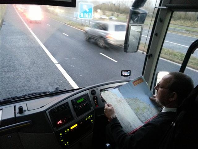 15:05 – Coach stopped at Wetherby services. Colin and the driver are re-attaching the sign!