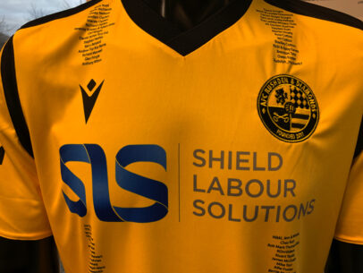 The away shirt which is sponsored by Shield Labour Solutions on the front, In support of CALM on the sleeve along with Fuelsell on the…
