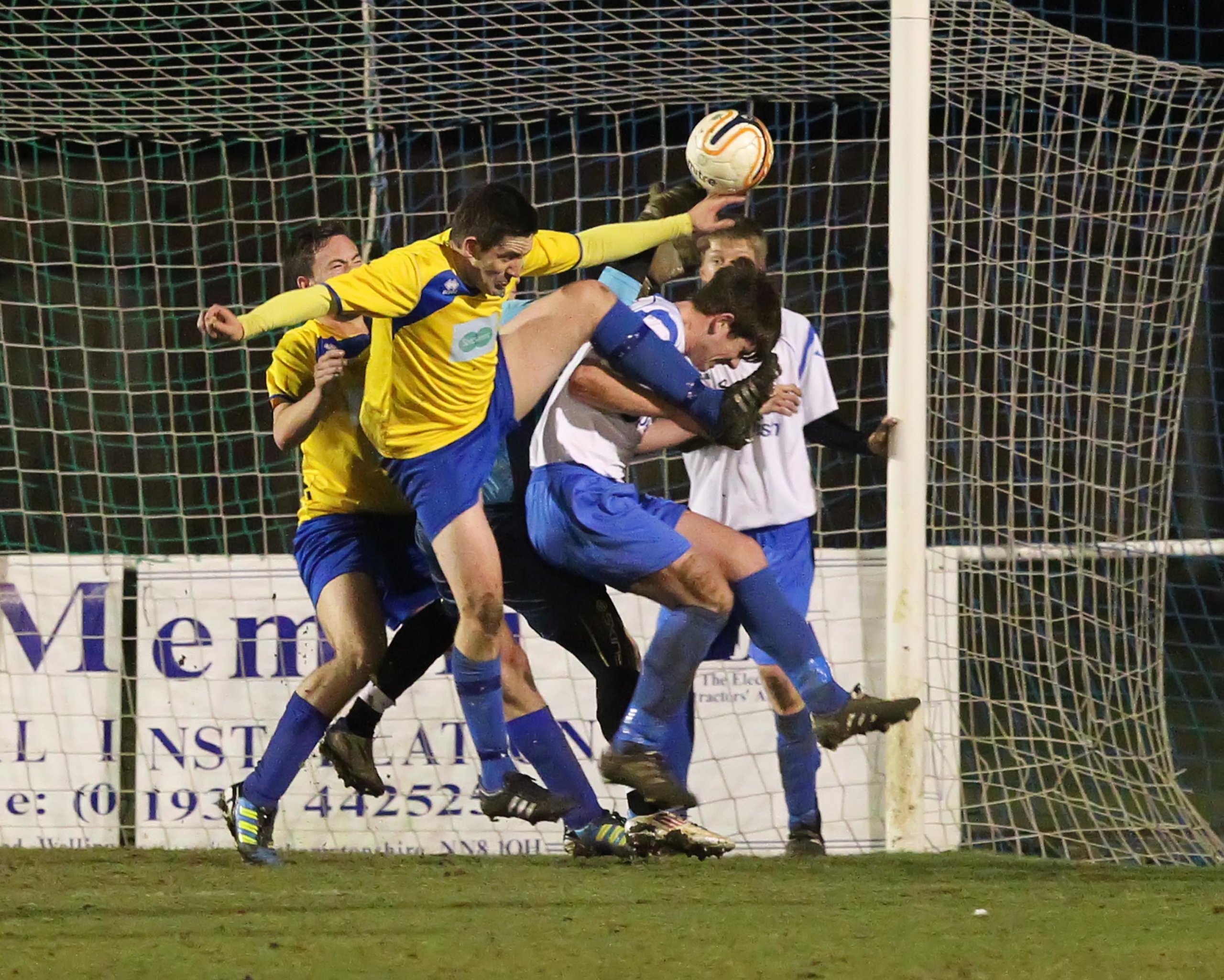 The home side got off to the brighter start, forcing a corner inside the opening few minutes which was spilt by Ashley Foulger and headed just over the Diamonds’ crossbar. Wellingborough’s tricky right winger, Wayne Richardson, was causing problems for the AFC back line, and almost picked out the lanky Tom Liversedge with a dangerous cross, but Foulger did really well to claim the ball ahead of the striker.