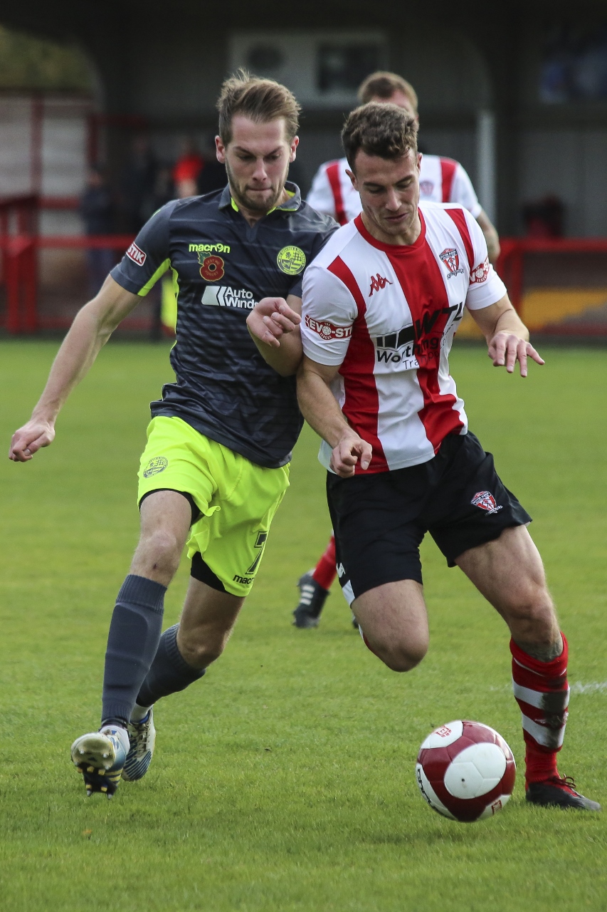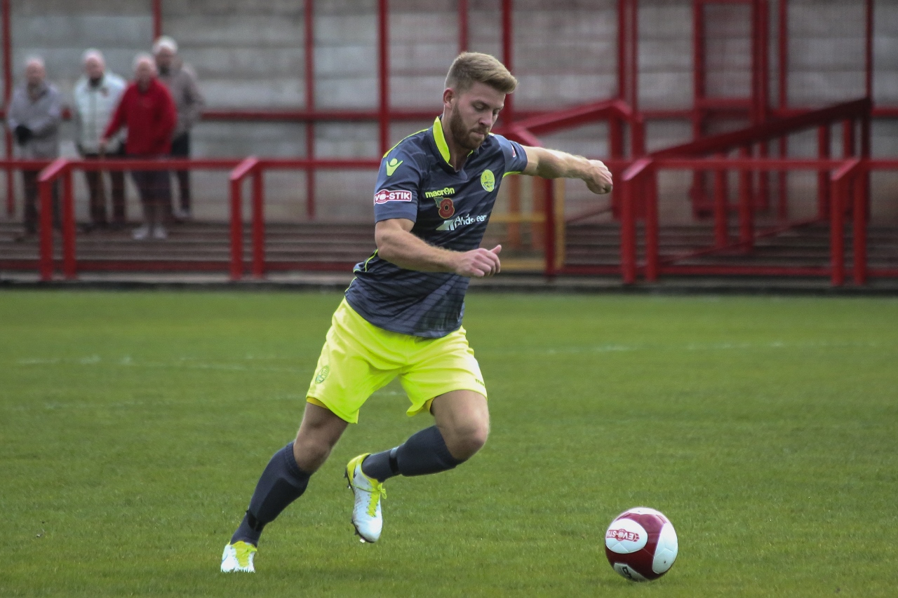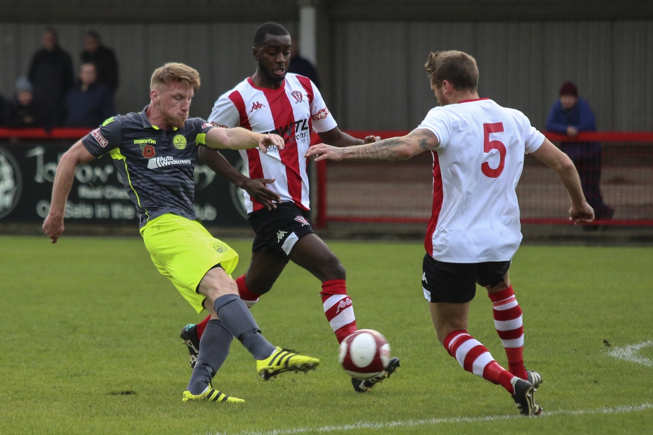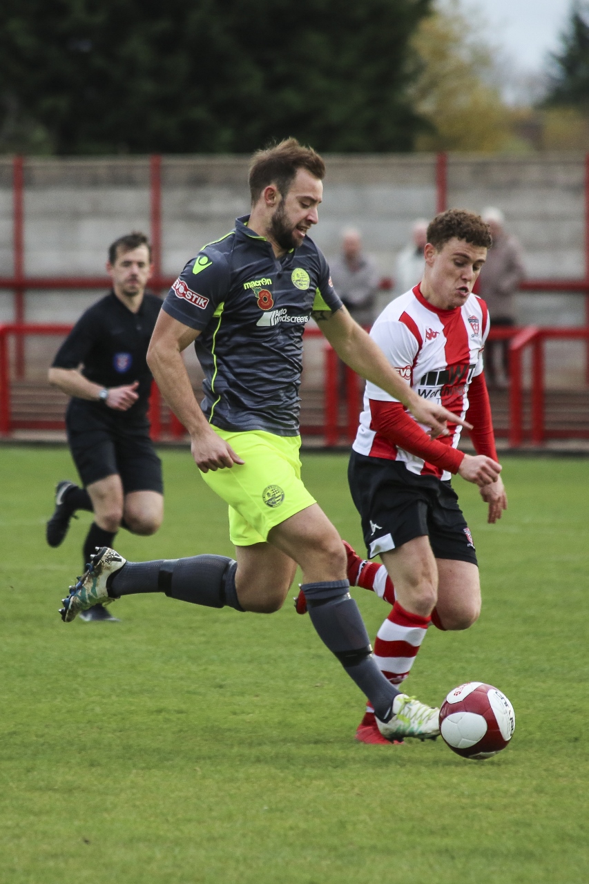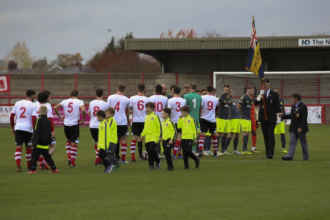 After the sides had shaken hands and the coin-toss had been conducted, a two minute silence was impeccably observed ahead of Remembrance Sunday and the 100 year centenary of WWI. Soon afterwards, referee Dale Baines blew to begin the match. The hosts created the opening opportunity in the fourth minute when full-back Matty Devine got away well down the left and whipped in an inviting cross. Striker Rob Hopley, who was the match-winner in the play-off clash of April 2017, rose to head goalwards, but Ben Heath dived to his left to make a good save.