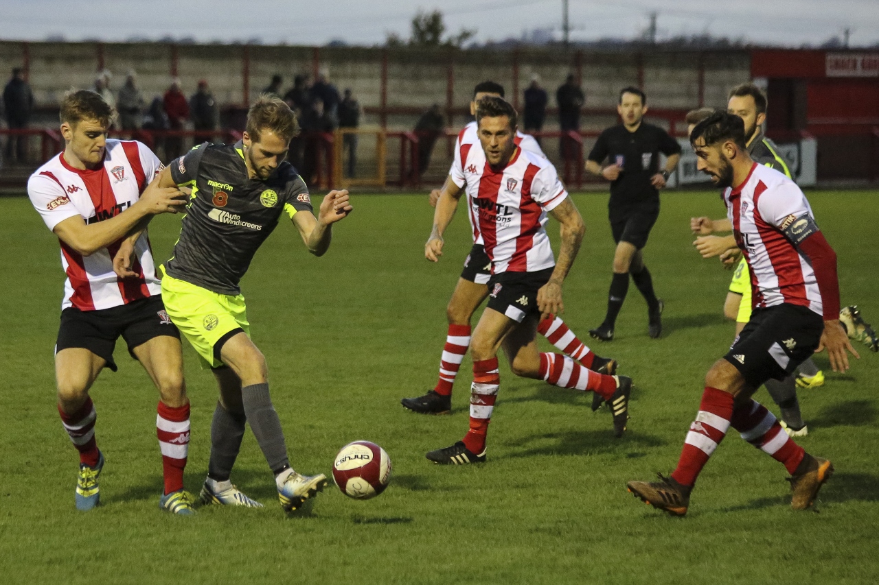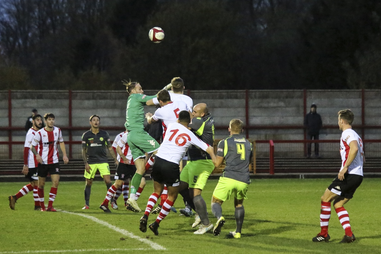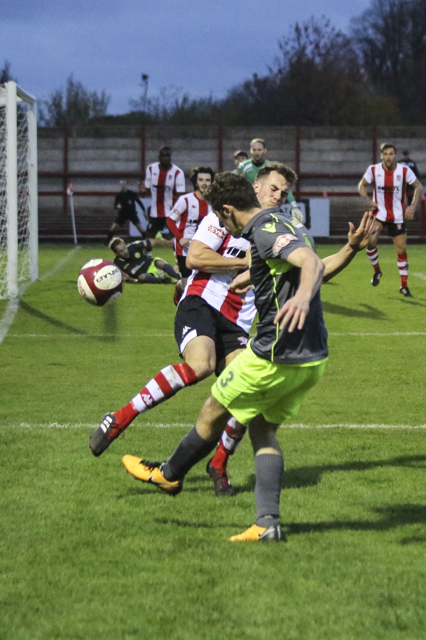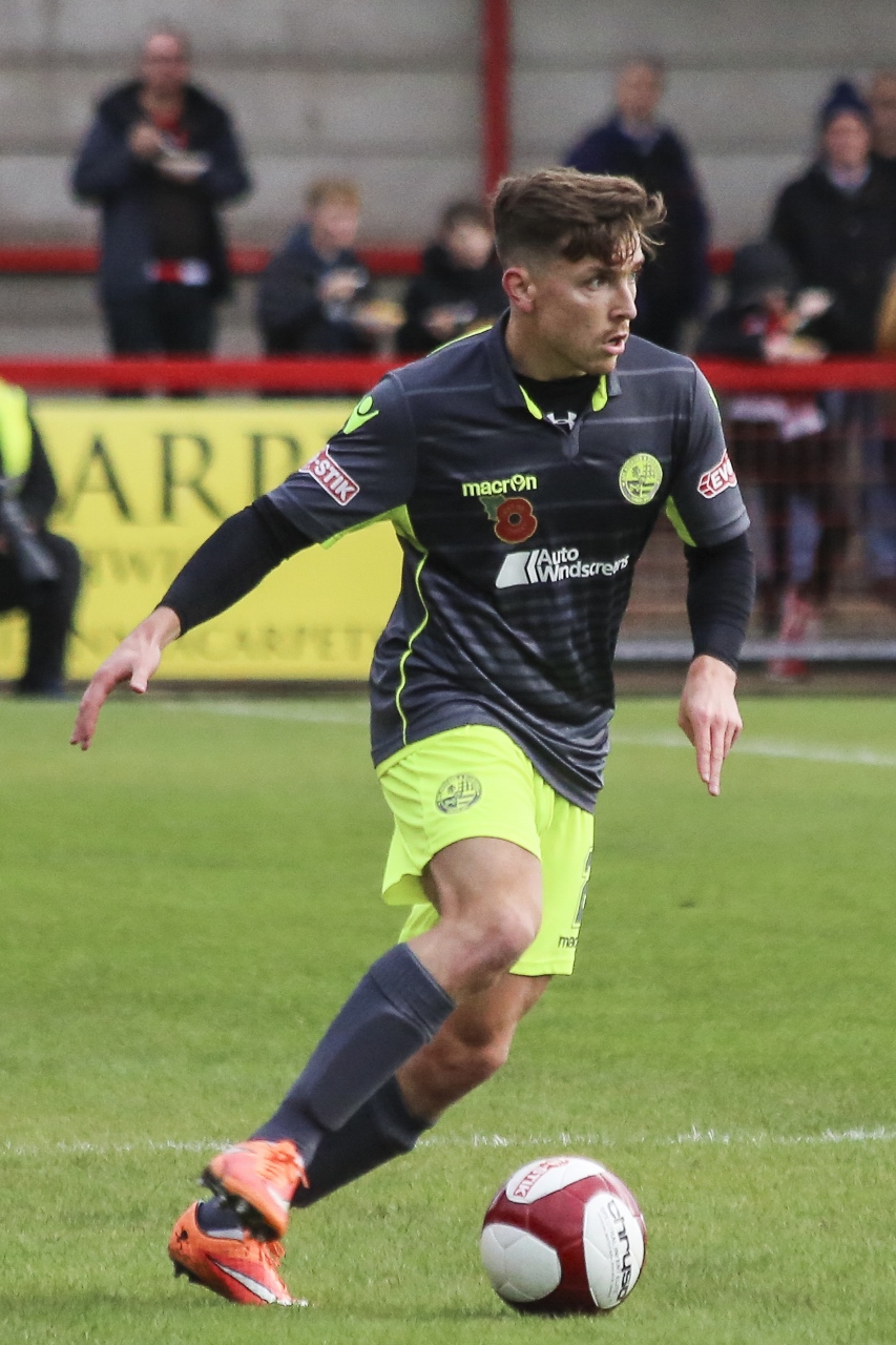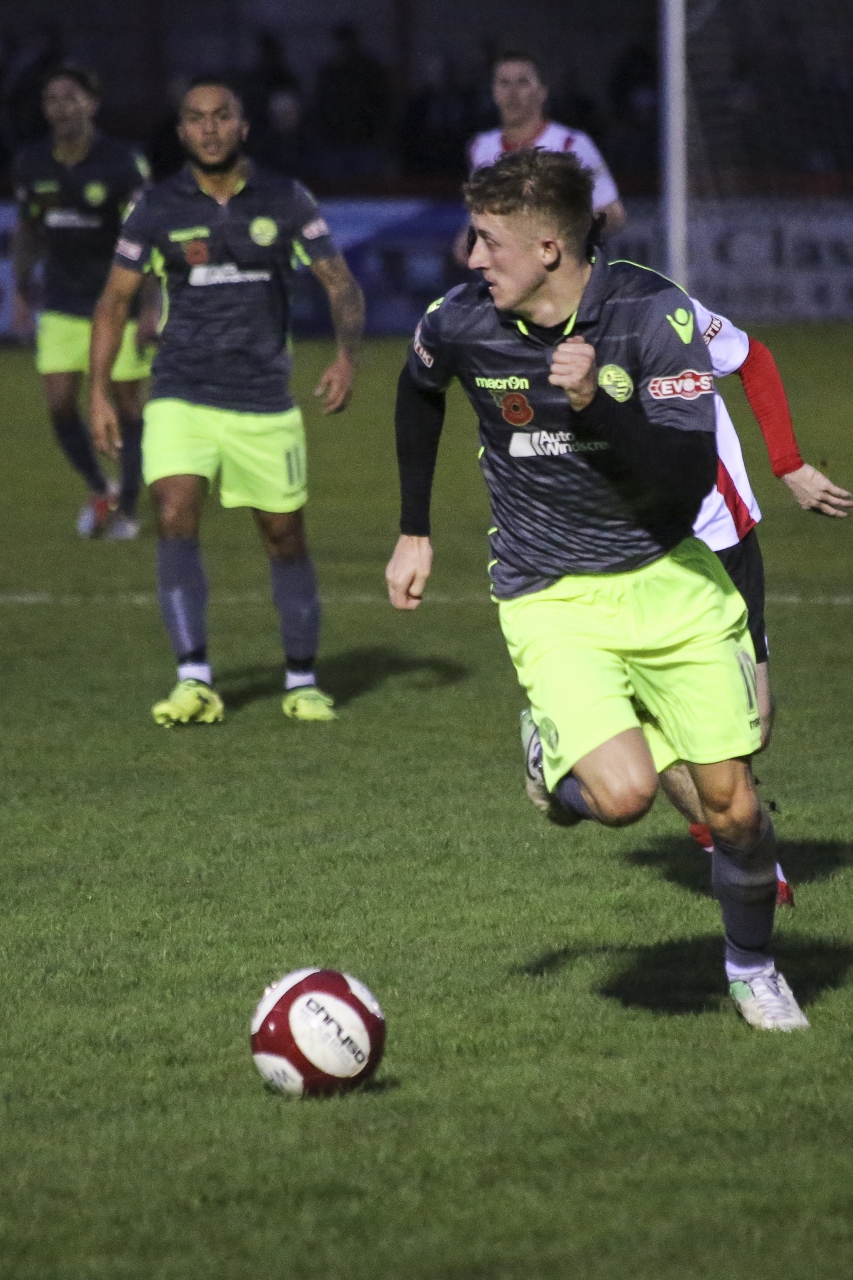 After the sides had shaken hands and the coin-toss had been conducted, a two minute silence was impeccably observed ahead of Remembrance Sunday and the 100 year centenary of WWI. Soon afterwards, referee Dale Baines blew to begin the match. The hosts created the opening opportunity in the fourth minute when full-back Matty Devine got away well down the left and whipped in an inviting cross. Striker Rob Hopley, who was the match-winner in the play-off clash of April 2017, rose to head goalwards, but Ben Heath dived to his left to make a good save.