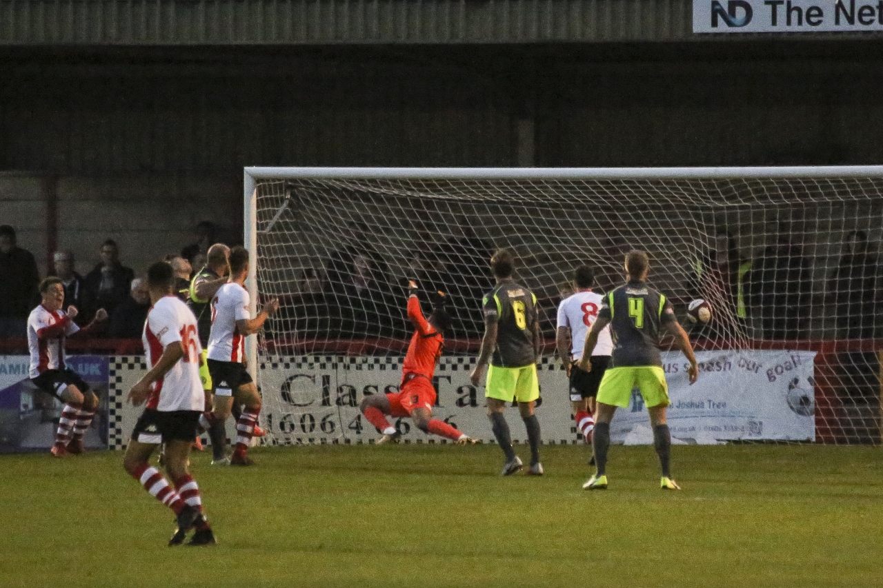 Diamonds had made a positive start to the second period and had begun largely on the front foot, and they came within inches of equalising in the 55th minute. They won a free-kick just outside the area on the right, and Hicks clipped in a dangerous delivery that found the leaping Westbrook. His header looked for all the world that it would find the top corner of the net with Hall rooted to the spot, but instead it hit the crossbar and bounced away to safety.
